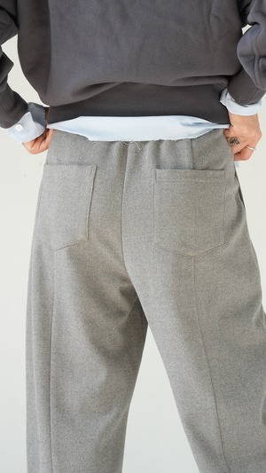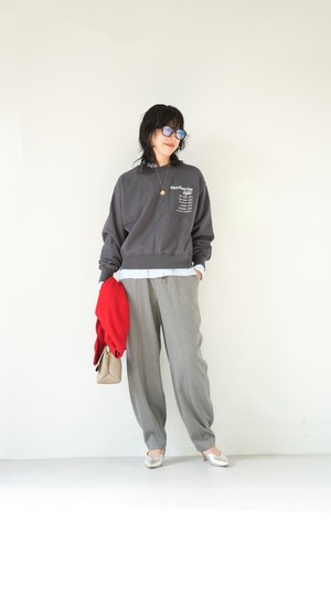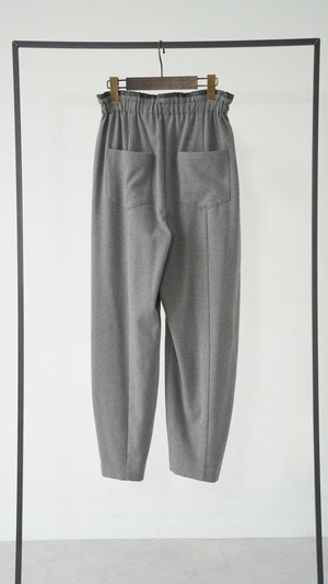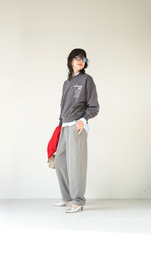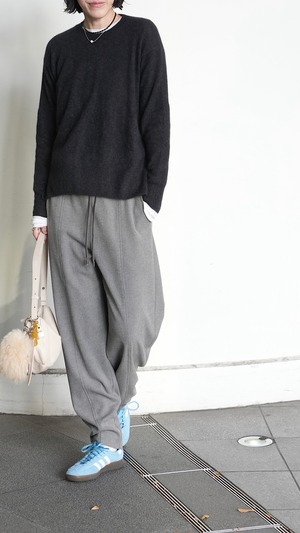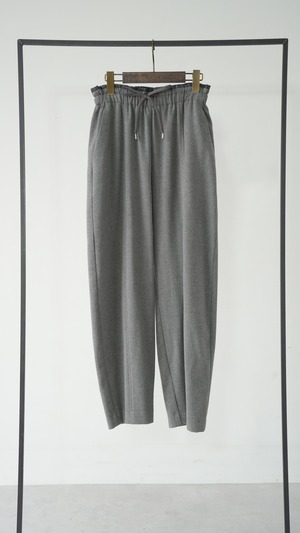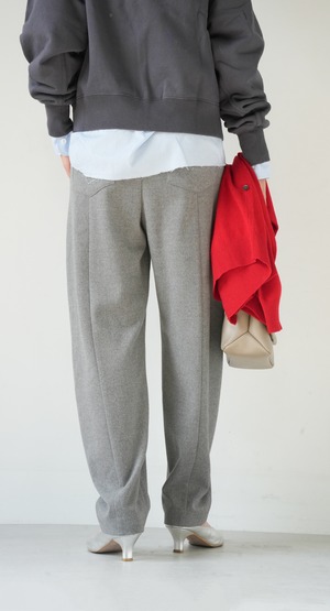 落ち感のある柔らかなジャージー素材を使用したカーブラインパンツ。たっぷりとギャザーを寄せたイージーなウエストで、なめらかな肌触りで心地よい穿き心地とリラクシーなムードが魅力。腰回りやもも周りがゆったりとしていてボディラインを拾わず、無理なくトレンドのシルエットを取り入れられるイージーボトムです。薄手でも透けが気にならず、通気性がよくムレにく炒め、緩やかな気候の変化や季節の移ろいを心地よく楽しめるパンツボトムです。幅が広いのでタイツやレギンスを重ねて調温も可能。長いシーズンを楽しめます。ウエストやポケット口にあしらわれたフェイクレザーが今季らしいアクセントポイント。