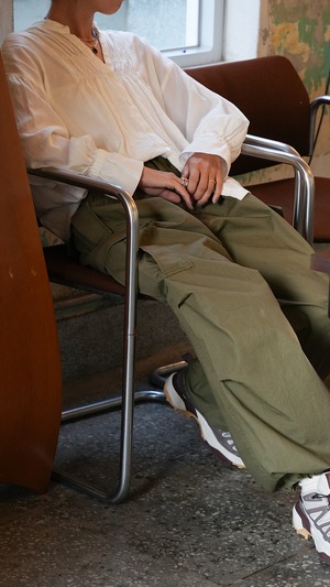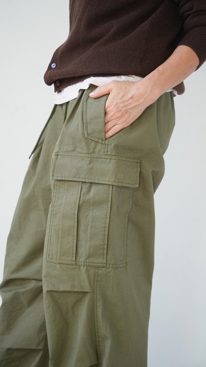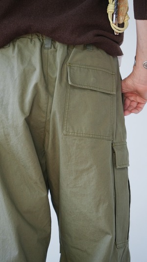 ハリ感のある素材に、染色加工でヴィンテージライクな風合いを加えたミリタリーパンツ。使い込む内にデニムのようなタテ落ち感が生まれ、経年変化も楽しめる一本です。ウエストや裾部分は絞ってシルエットの調整が可能。