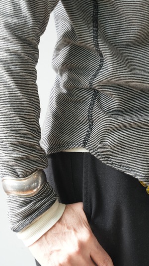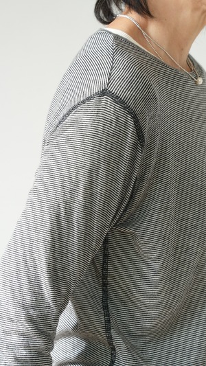 シルクの高級感とウールの伸縮性、さらにカシミヤの柔らかさを掛け合わせた特別なファブリックで仕立てたボーダーインナーTシャツ。