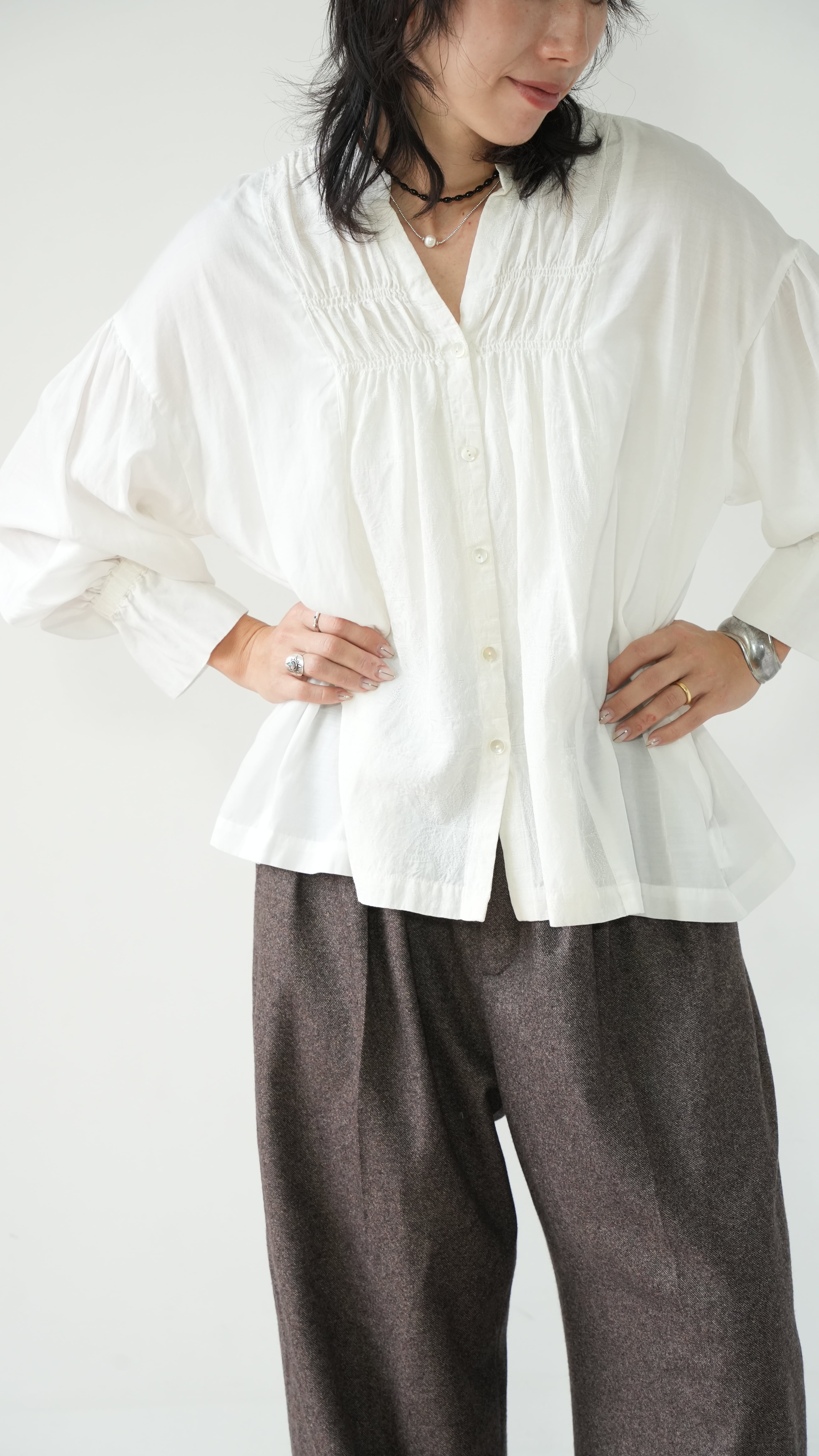 襟なしデザインに、顔まわりを品よく彩る繊細な刺繍とギャザー。