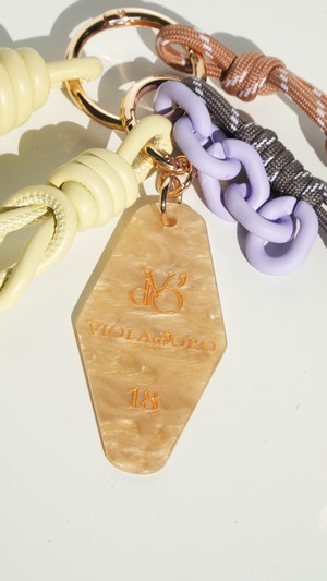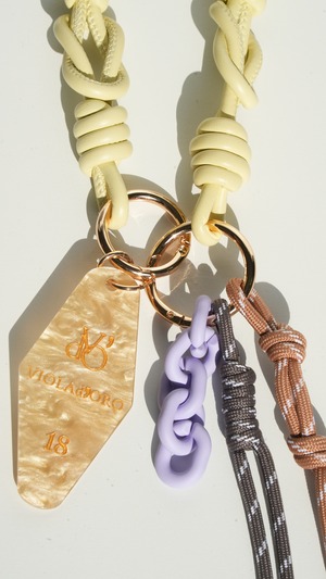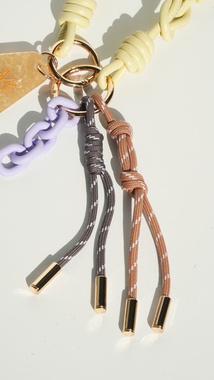 オリジナルロゴをあしらったアクリルパーツを中心に、レザーコード、パラコード、プラスチックチェーンをバランスよく組み合わせたデザインです。