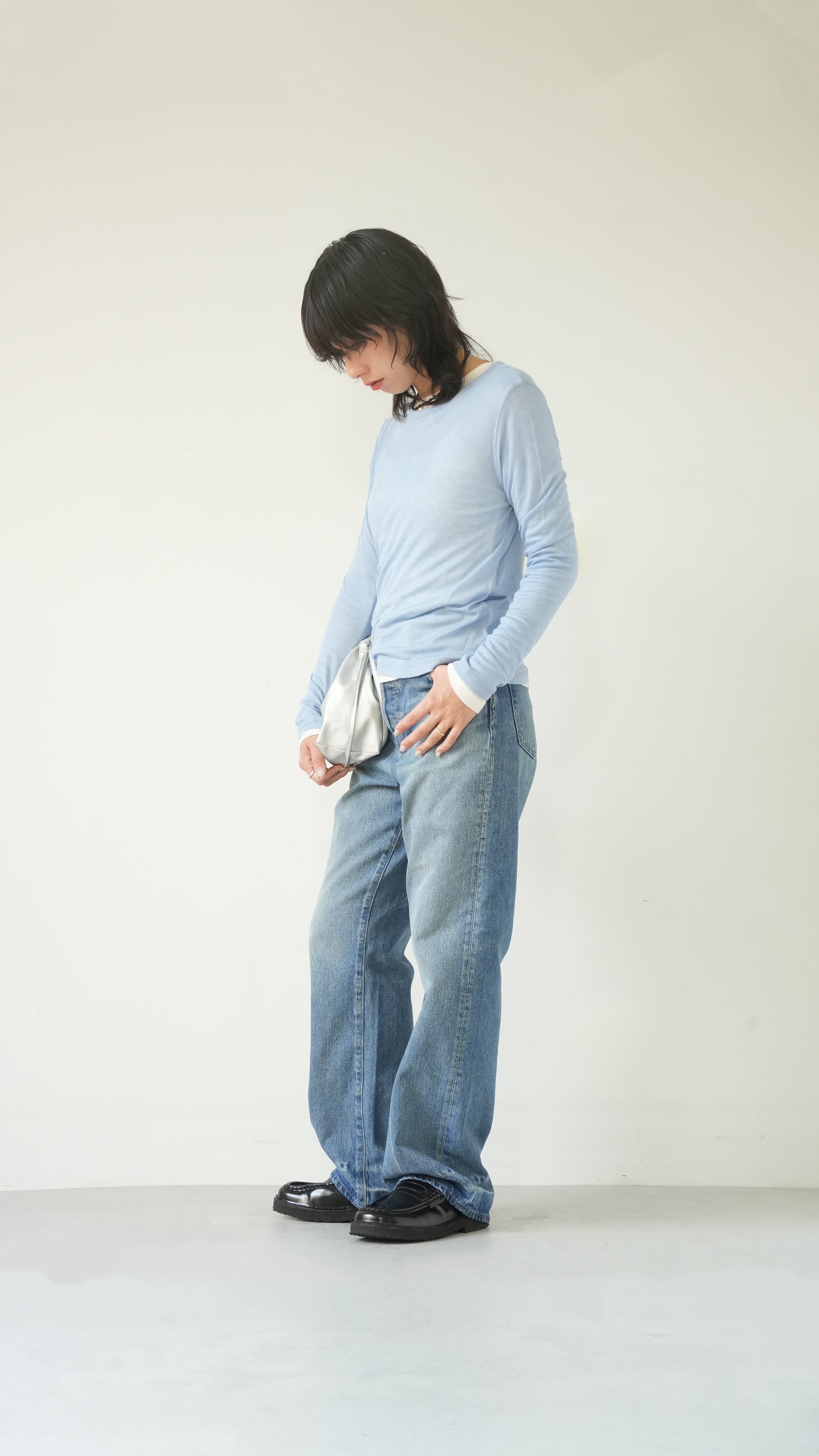 セーターの中に着、袖口や裾から別のカラーが見えるようにレイヤードしたり、体のラインを拾いすぎないサイズ感で1枚で着てもサマになるアイテムです。