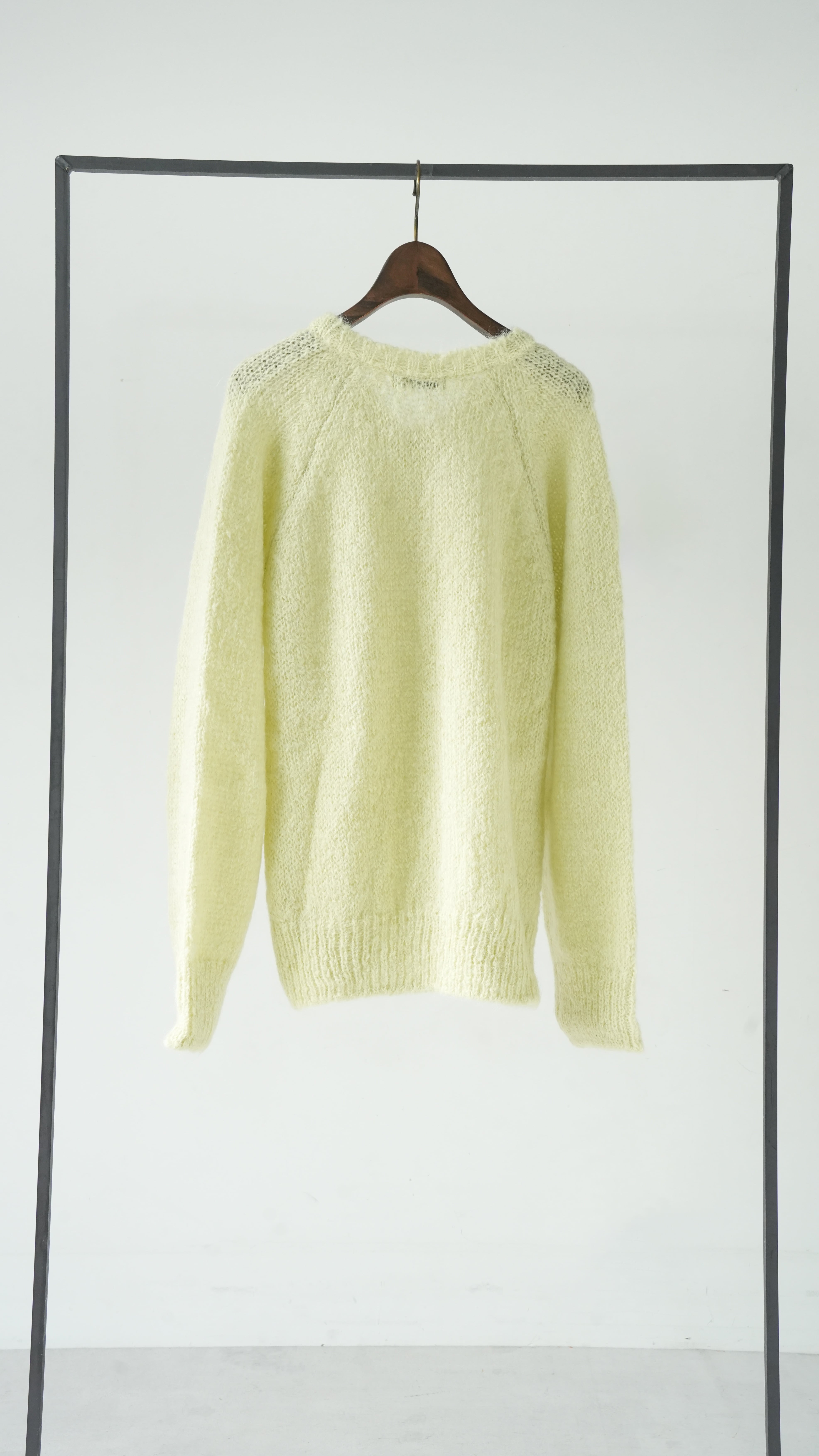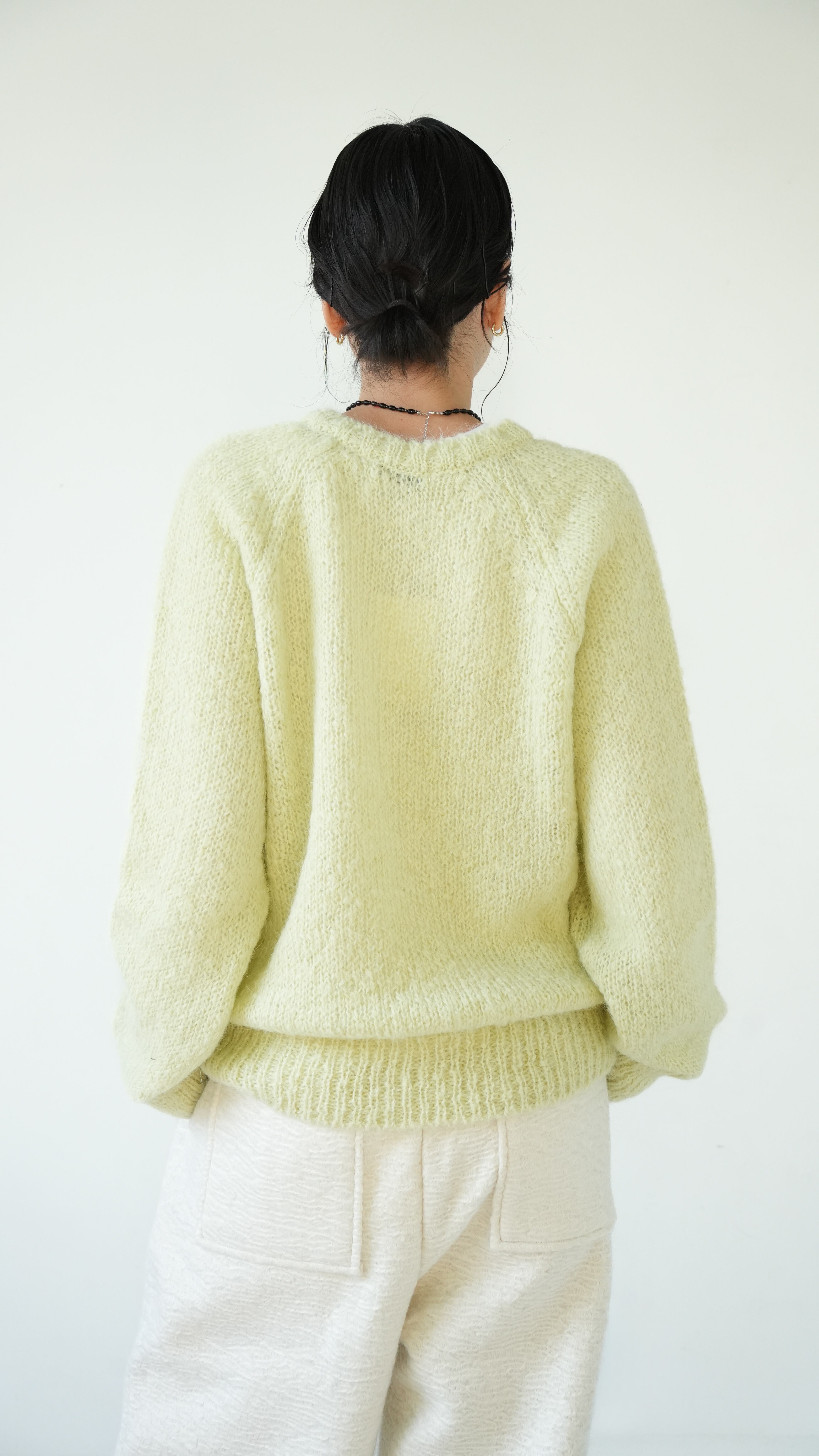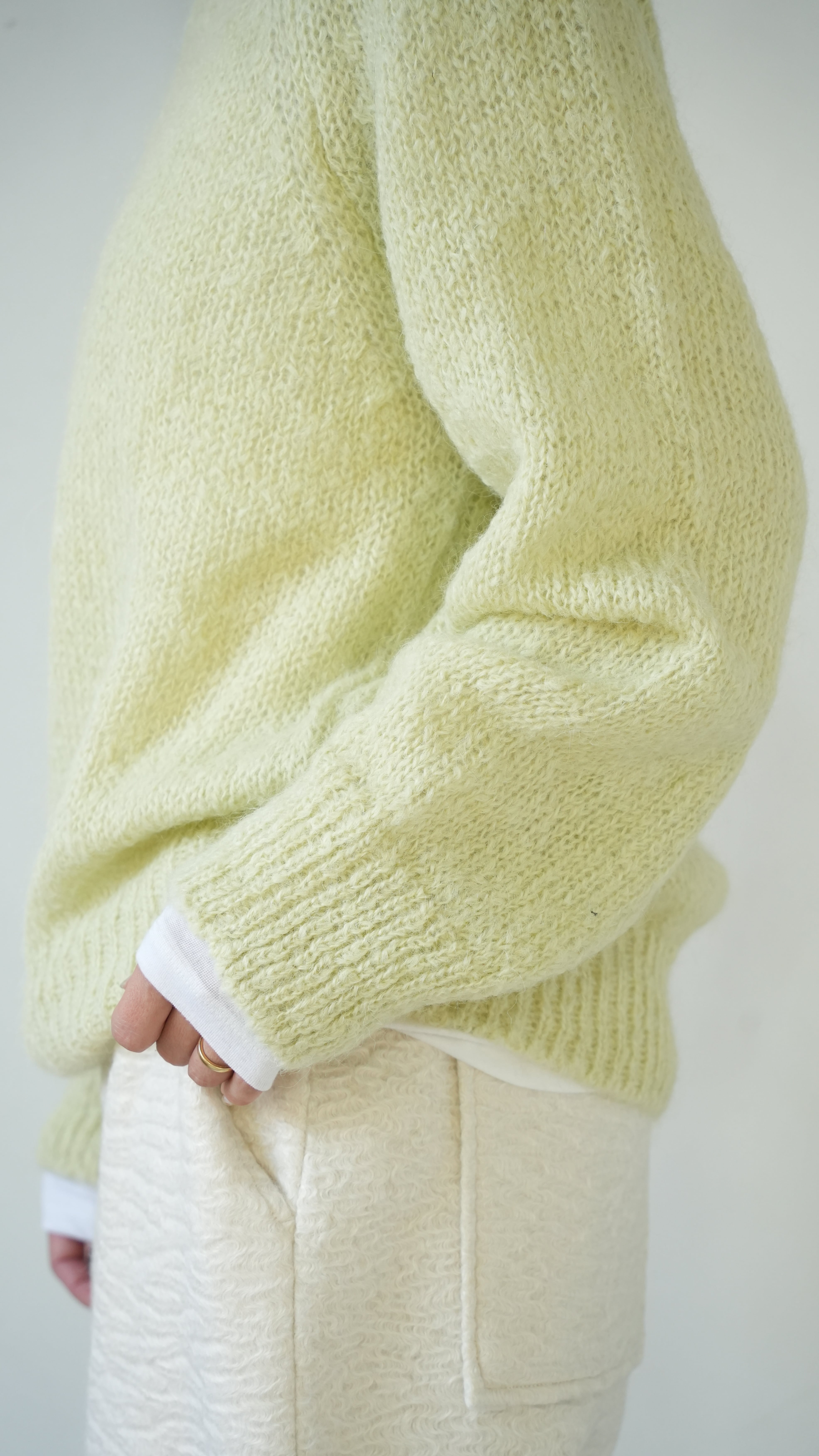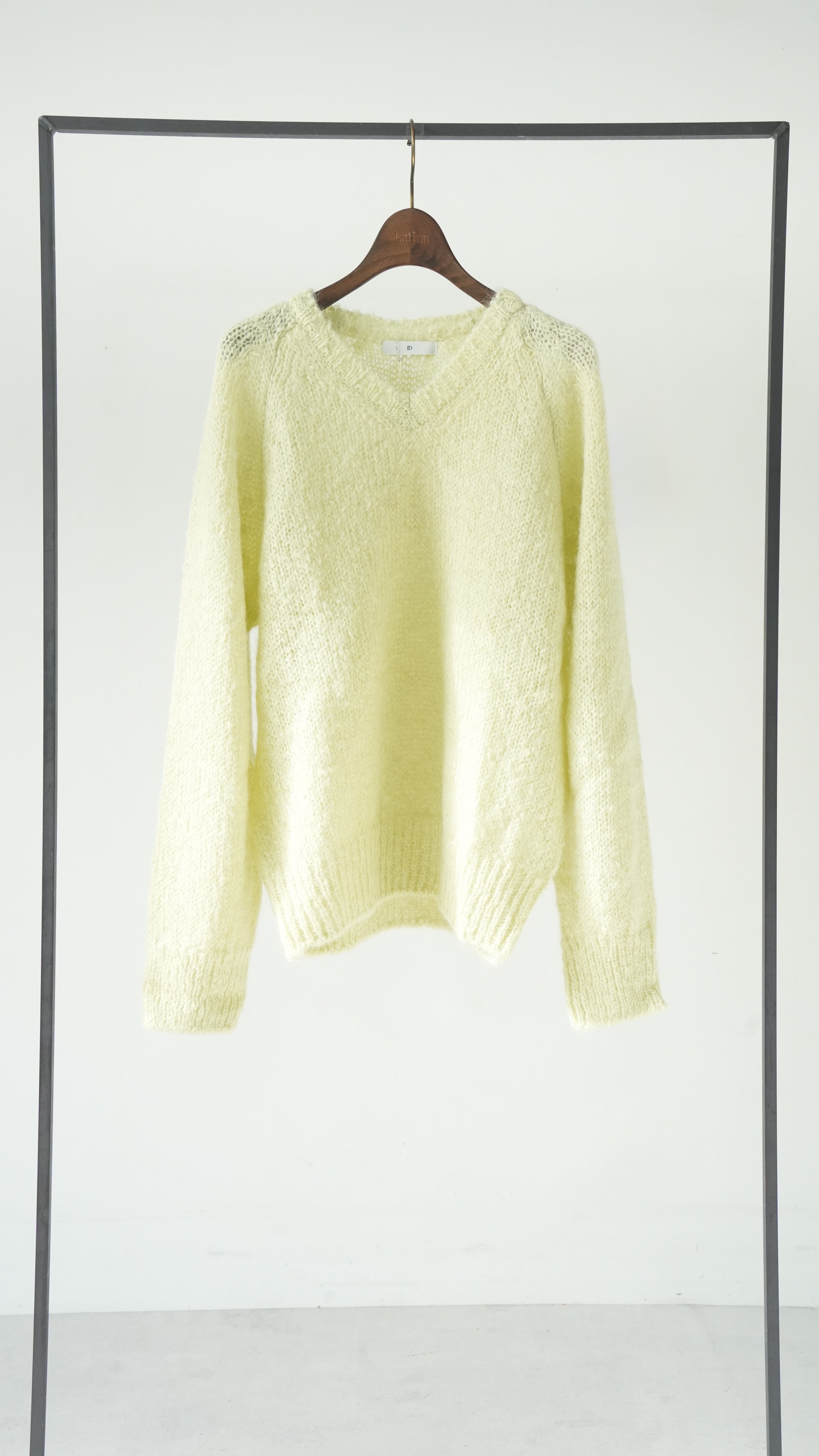 ふんわりと軽く、柔らかなモヘヤとアルパカをブレンドした糸を多本取りにし、ざっくりとしたローゲージで編み上げたVネックセーター