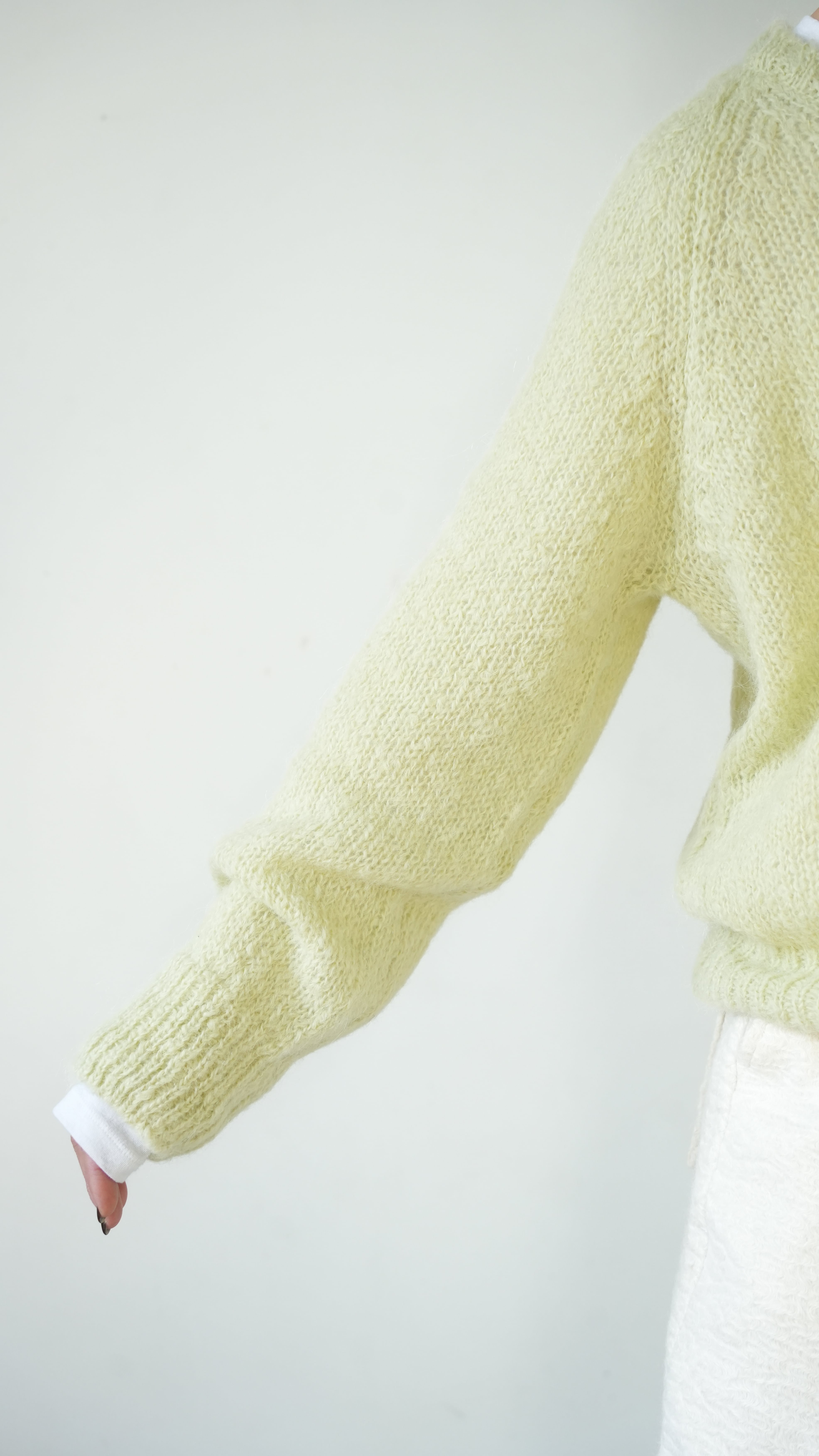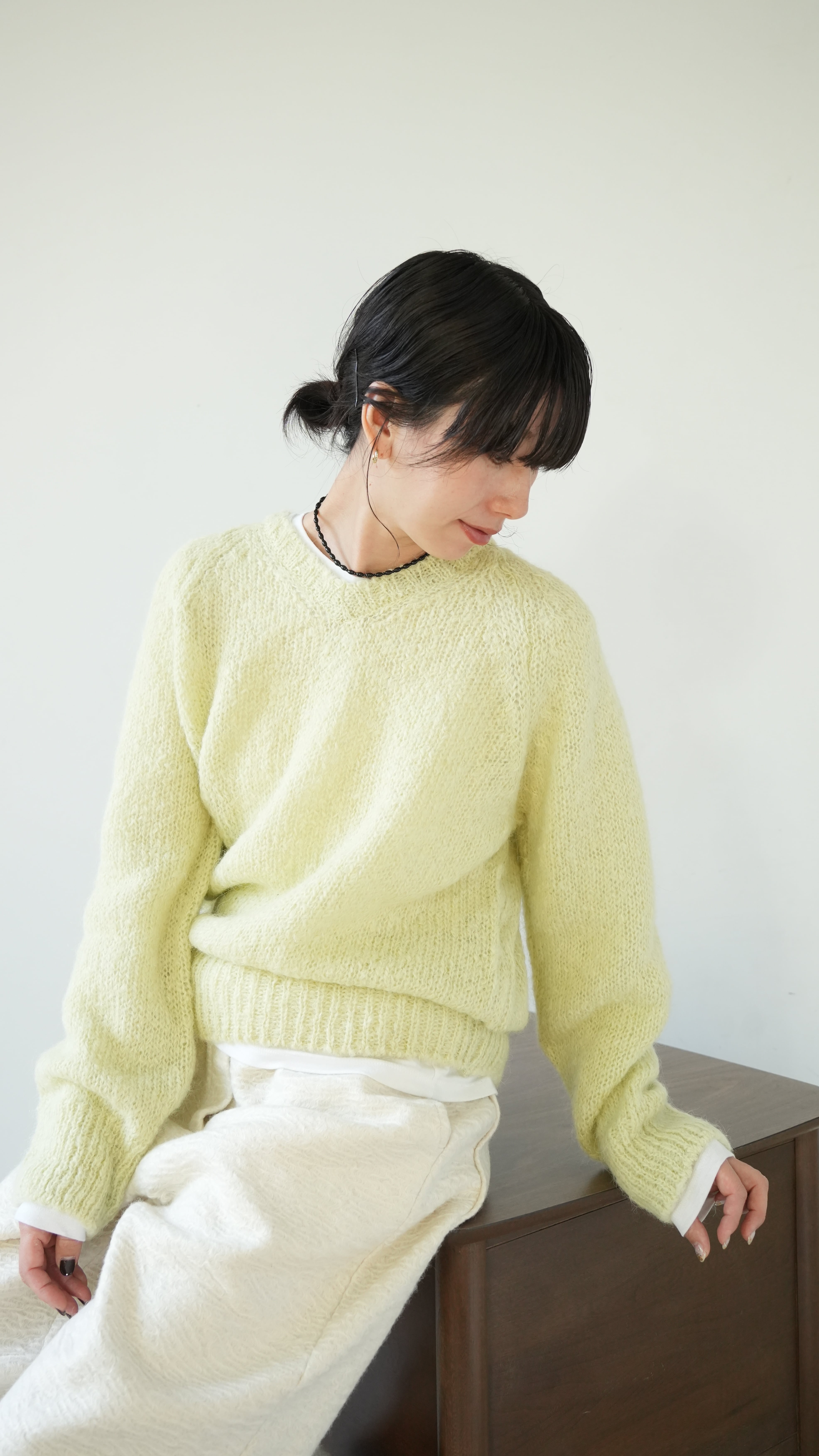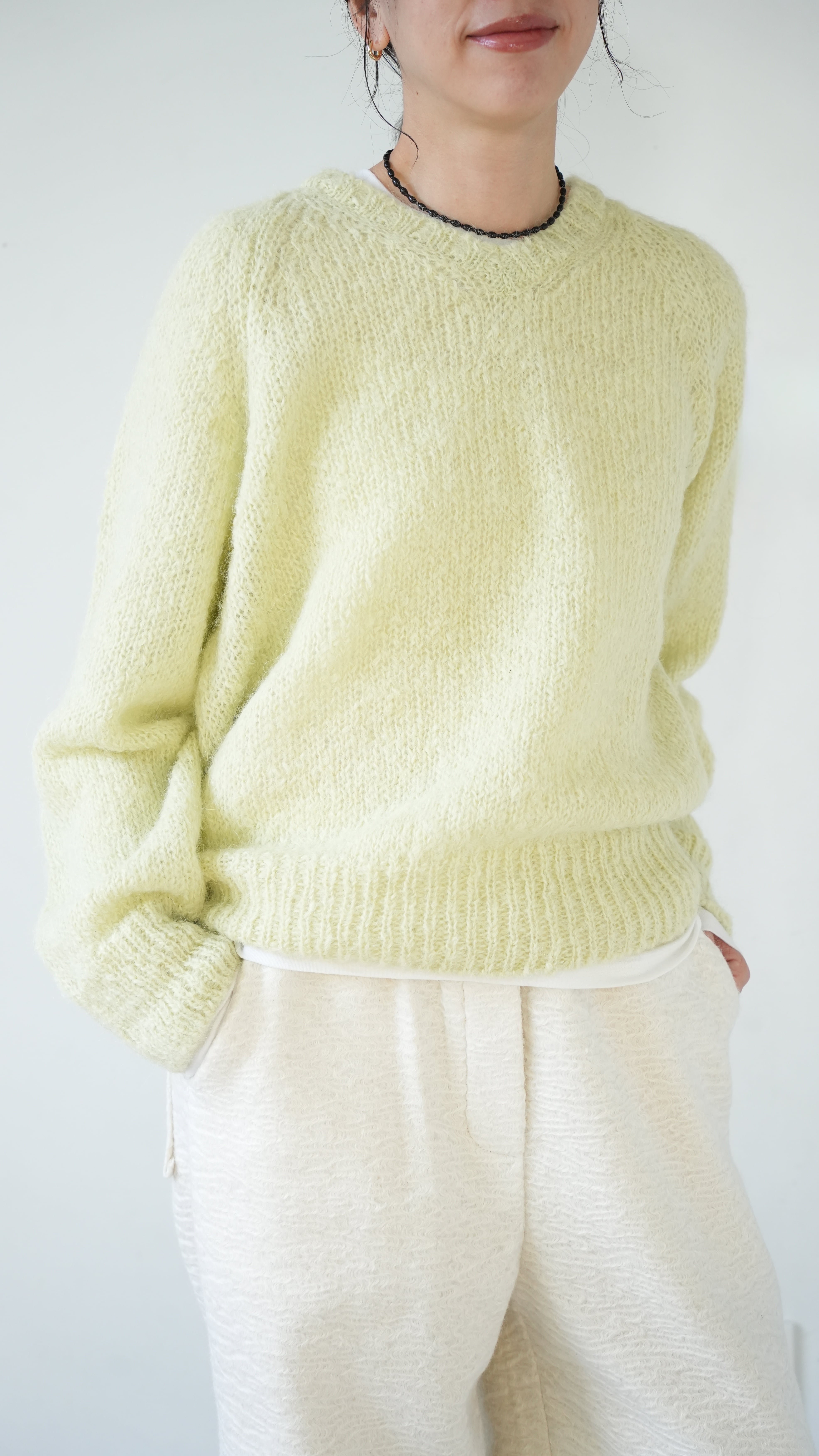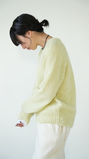 ふんわりと軽く、柔らかなモヘヤとアルパカをブレンドした糸を多本取りにし、ざっくりとしたローゲージで編み上げたVネックセーター