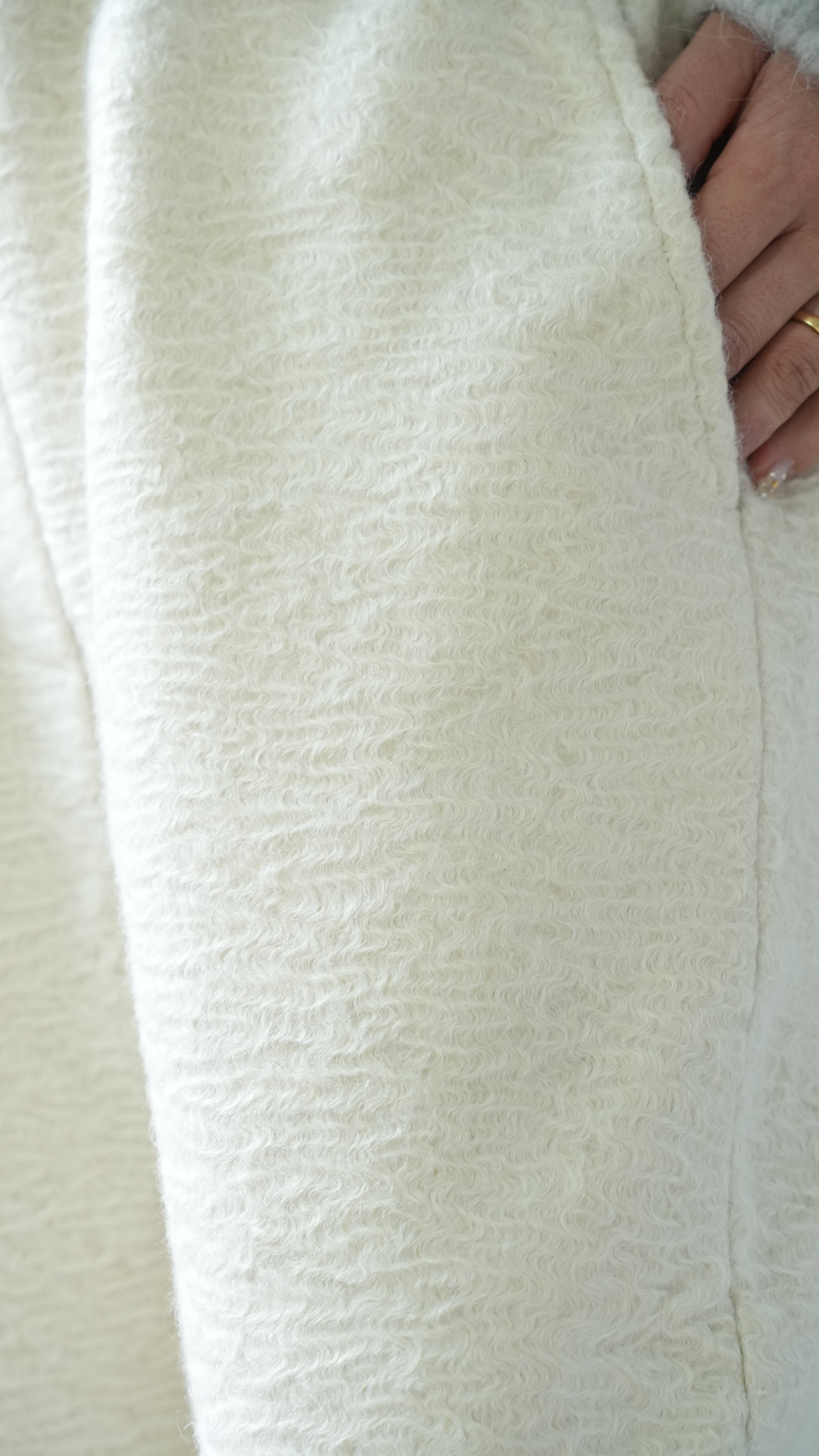 裾にコードが入ってるので、裾までまっすぐ落ちるラインで脚をすっきりと見せ外出先でも楽にお洒落に温かく着こなせる寒い日の万能なパンツです。