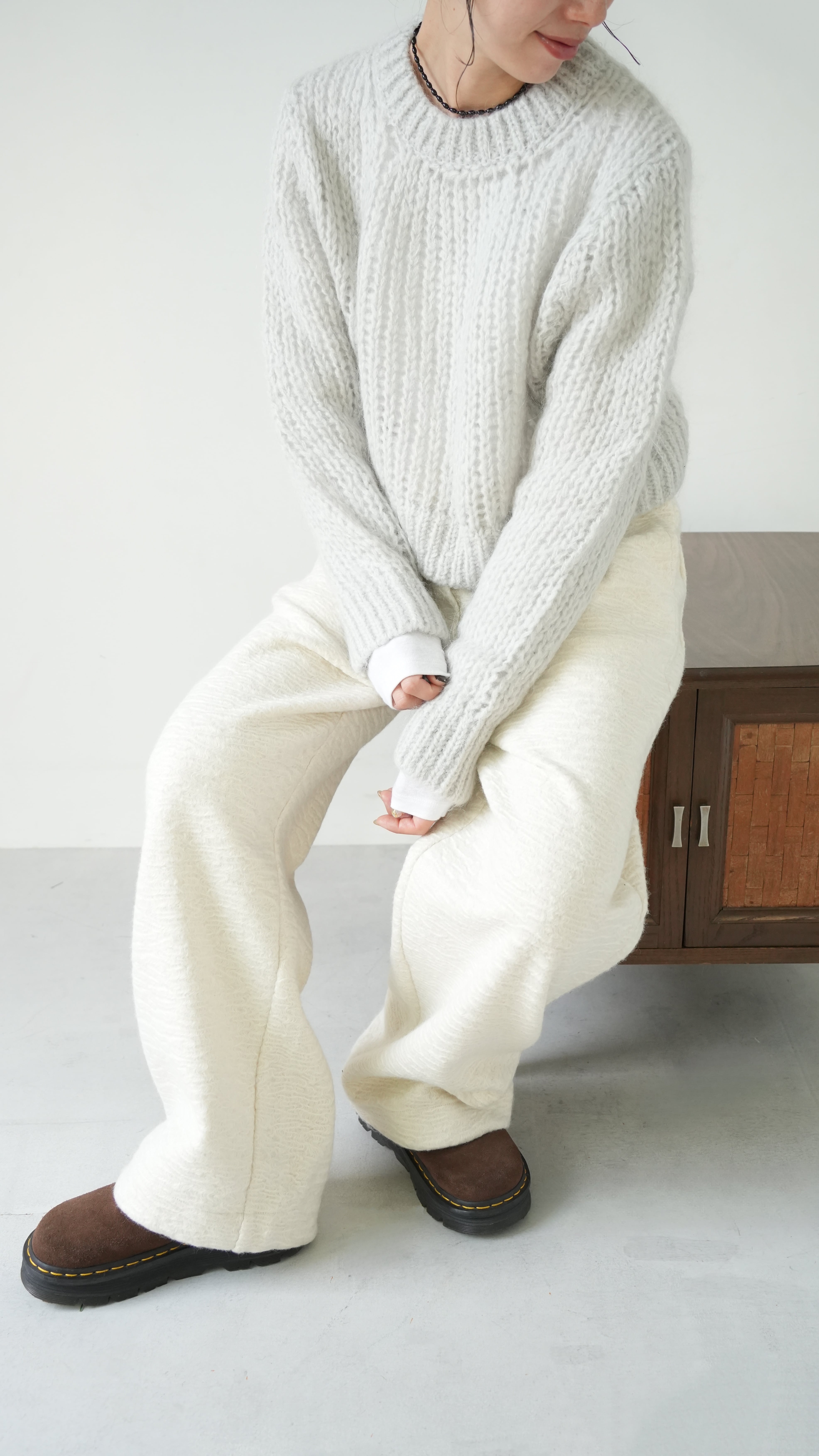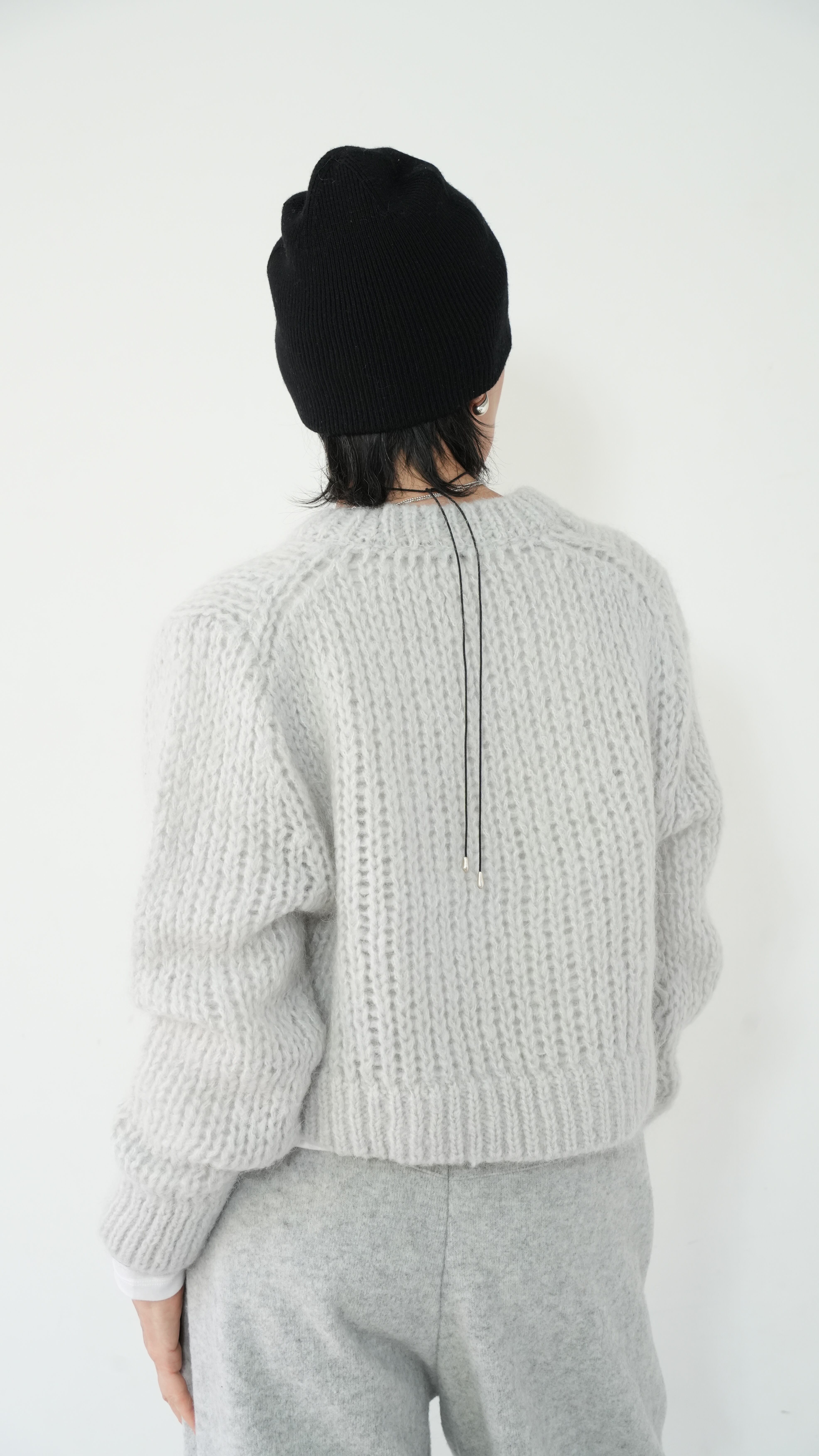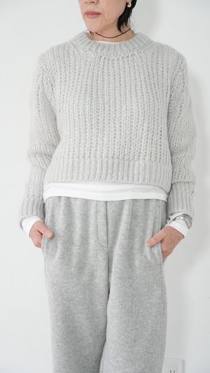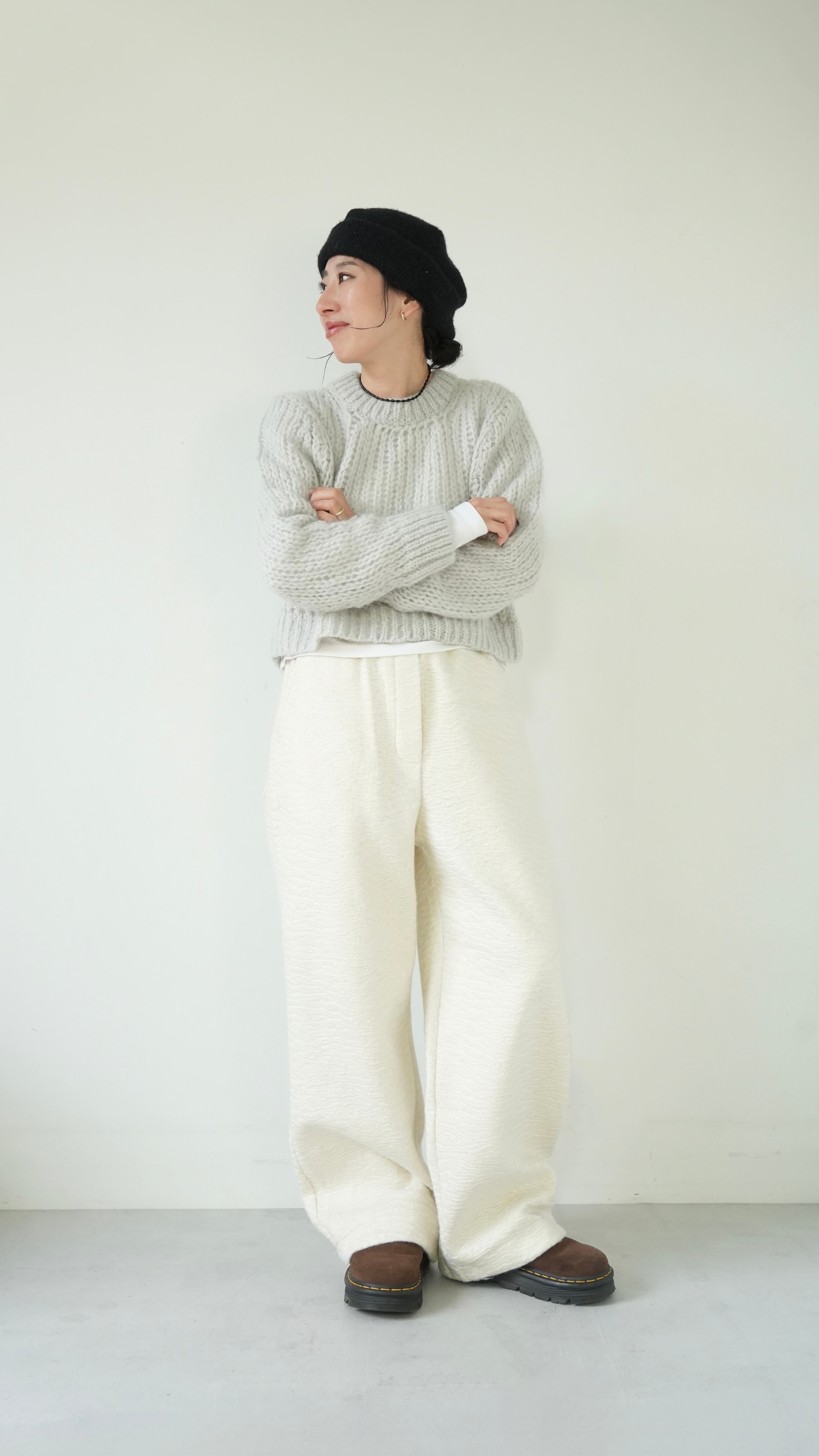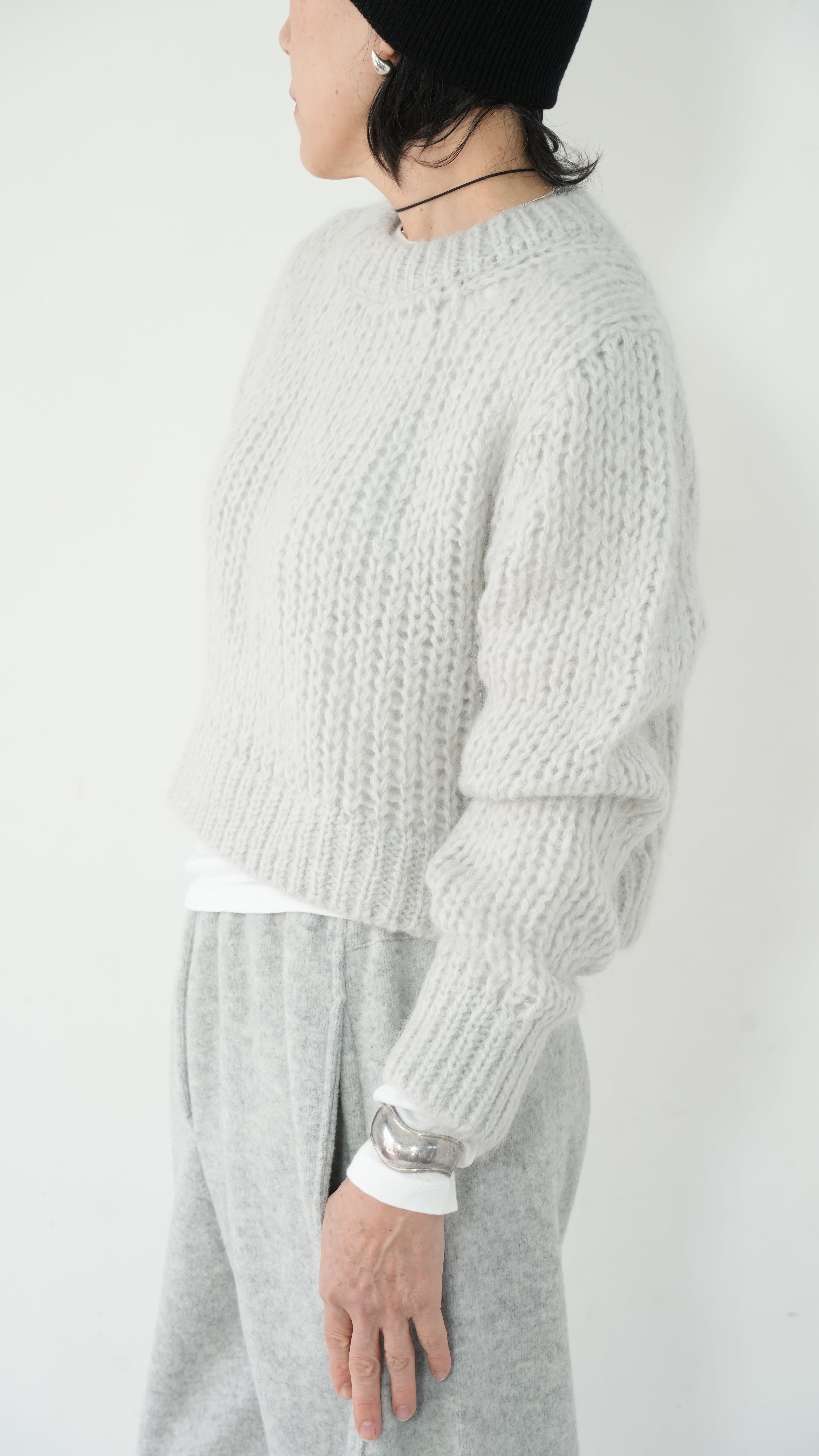 軽くて暖かいモヘアニットを、あえてメンズライクなベーシックニットをウエスト丈で仕上げ、洗練された表情に。