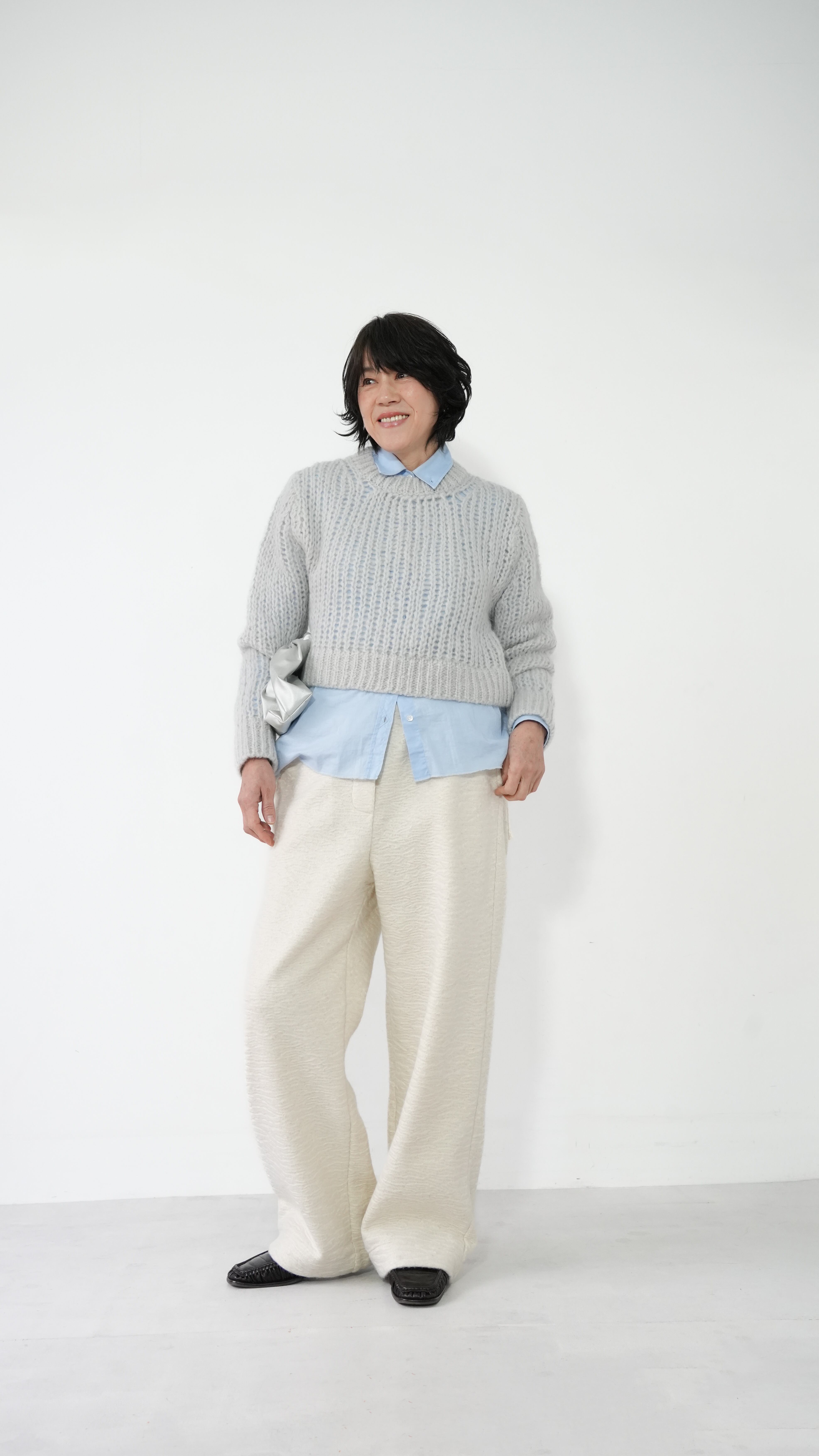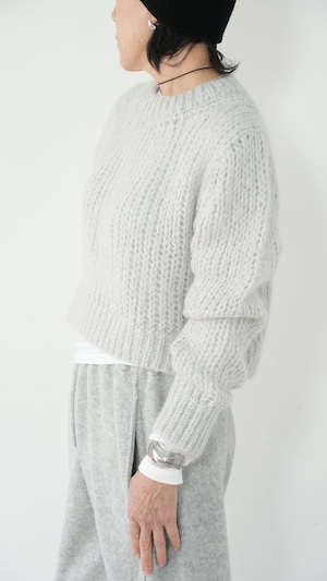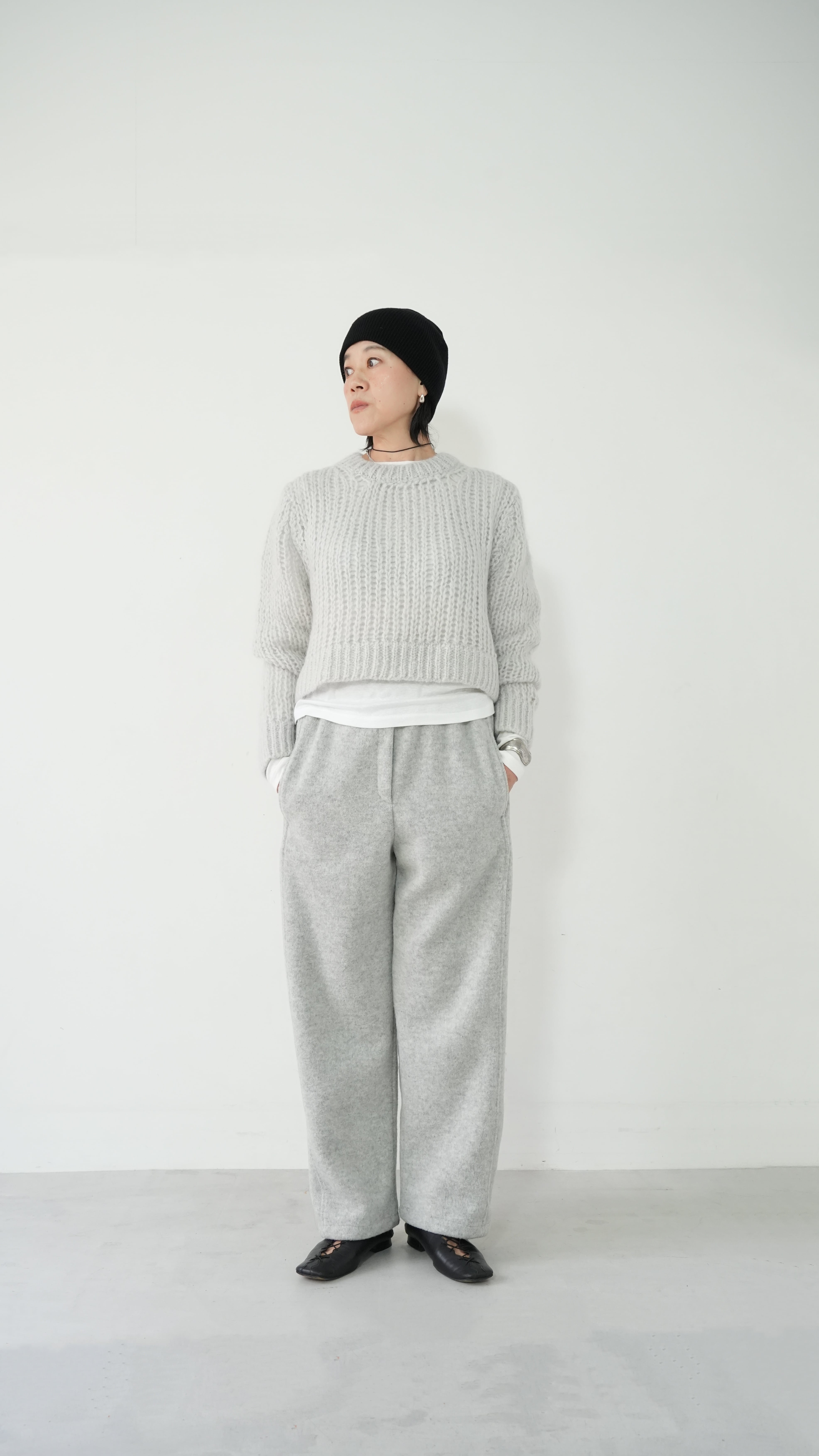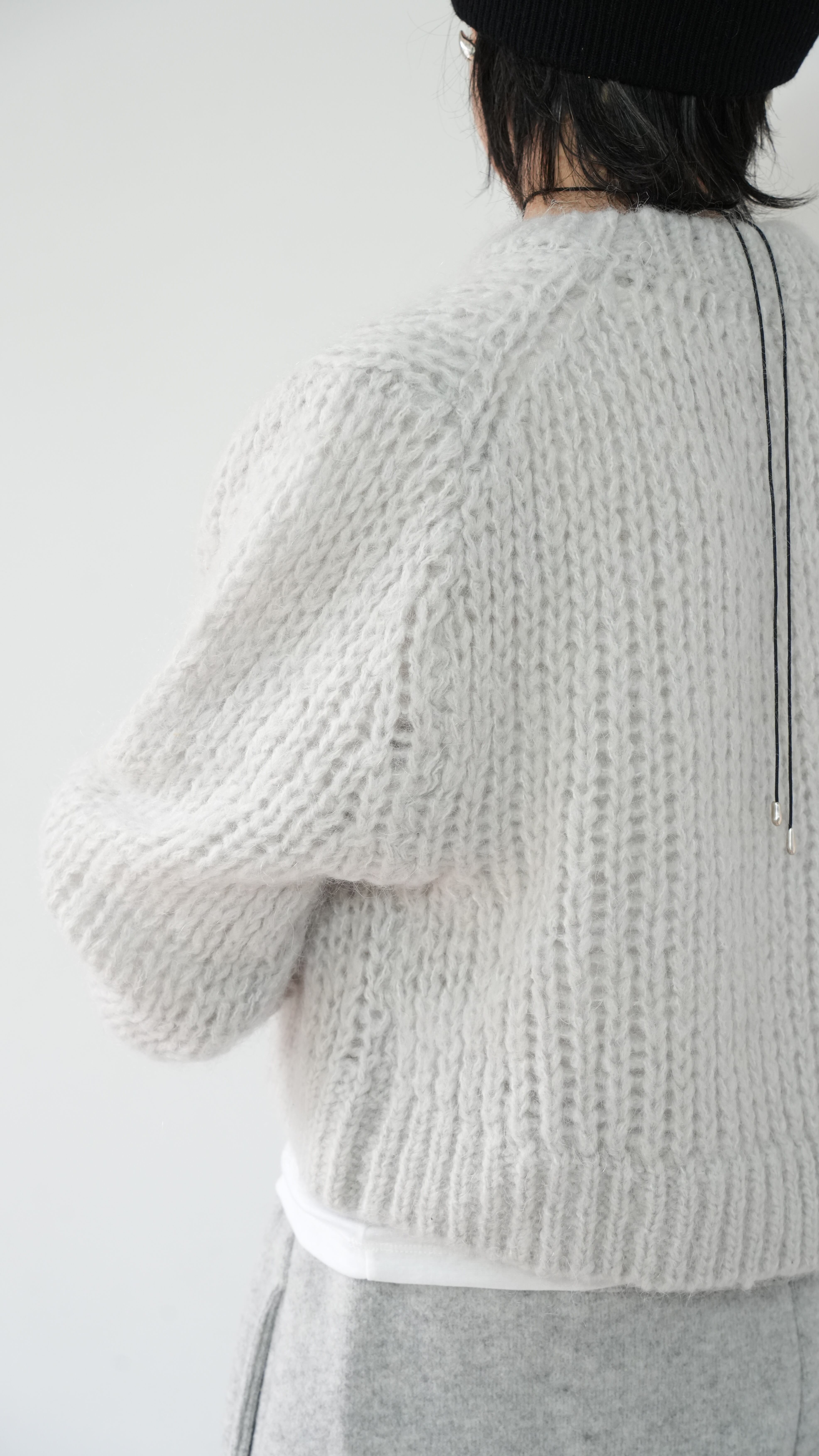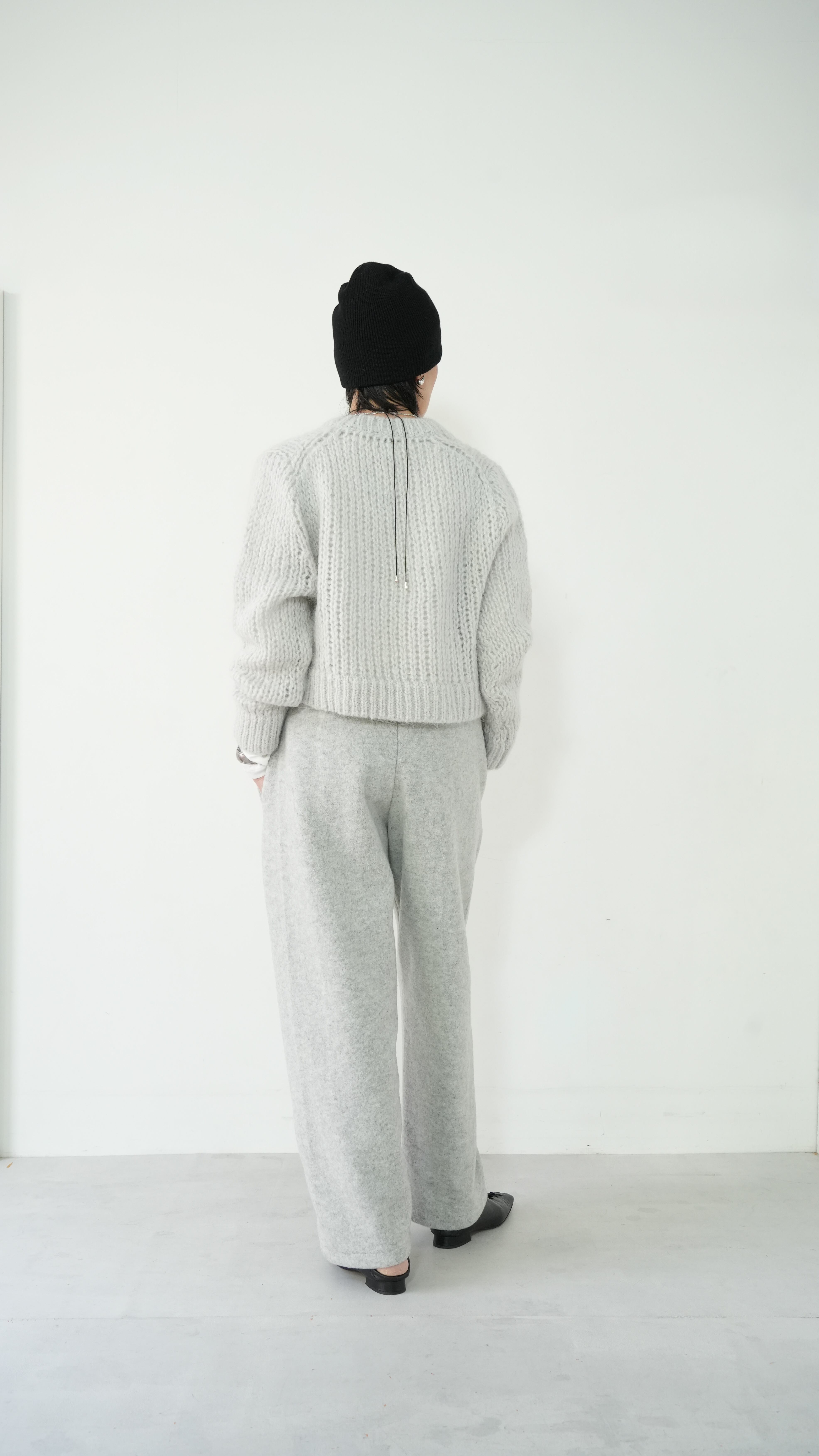 軽くて暖かいモヘアニットを、あえてメンズライクなベーシックニットをウエスト丈で仕上げ、洗練された表情に。