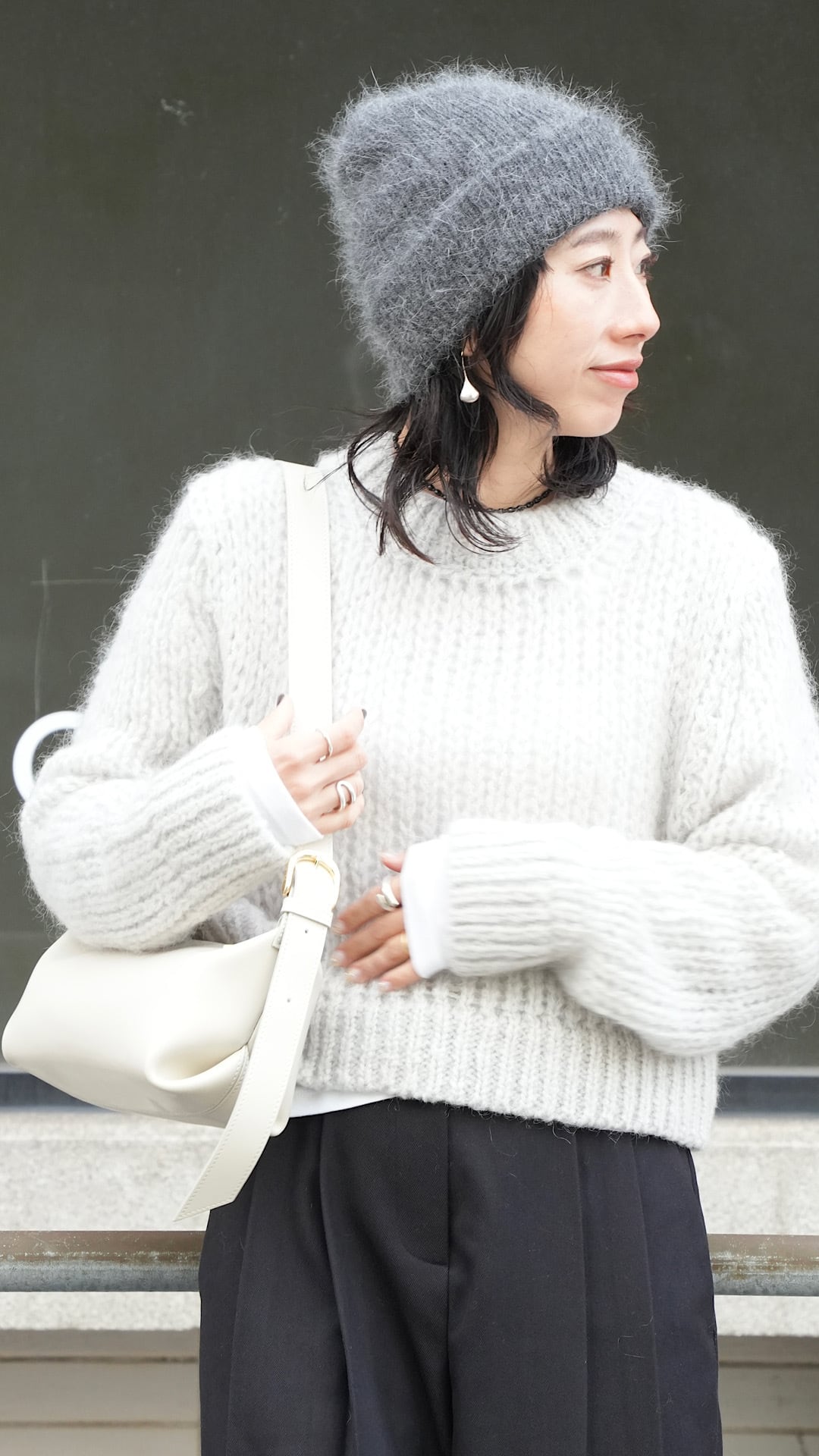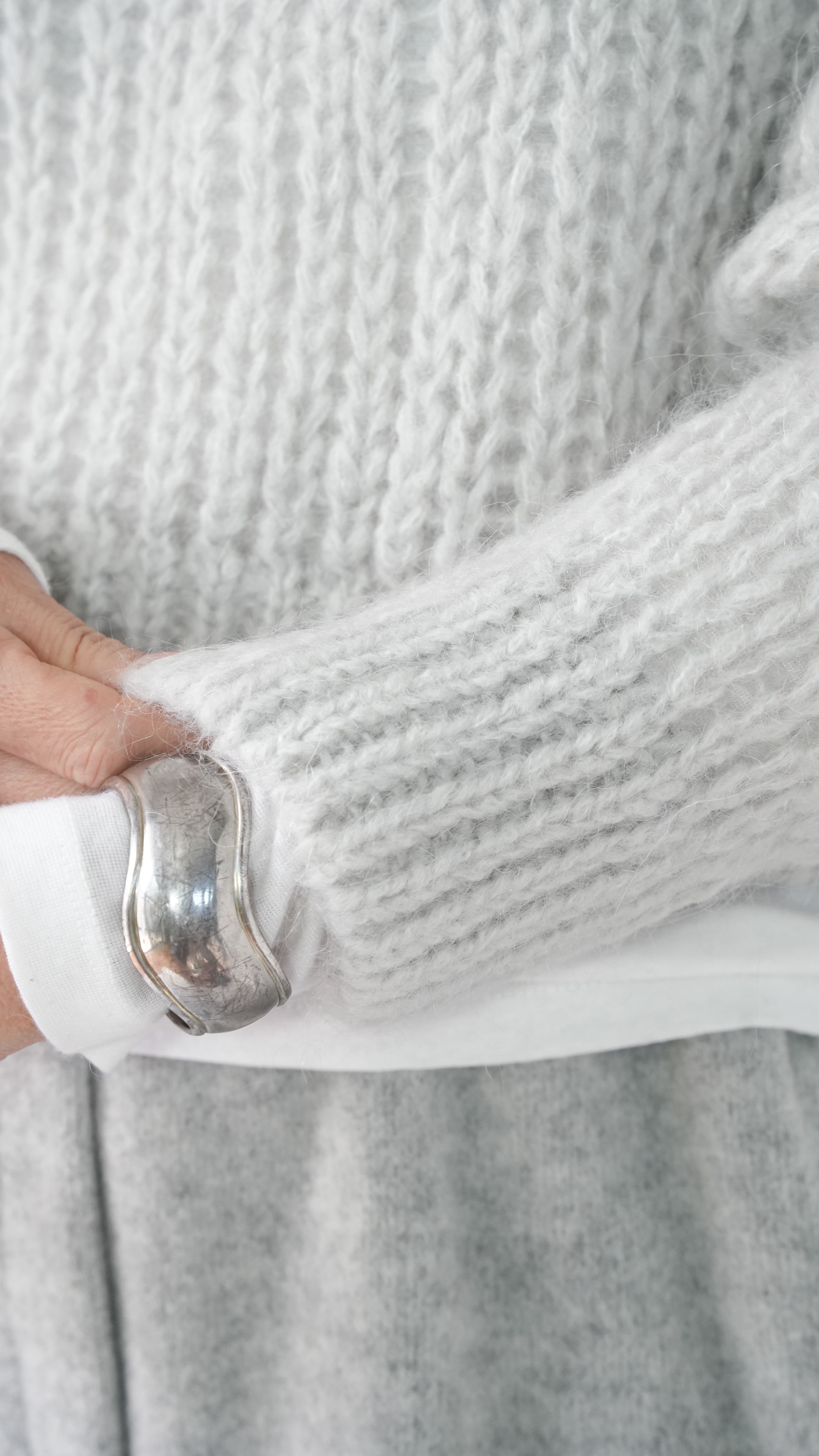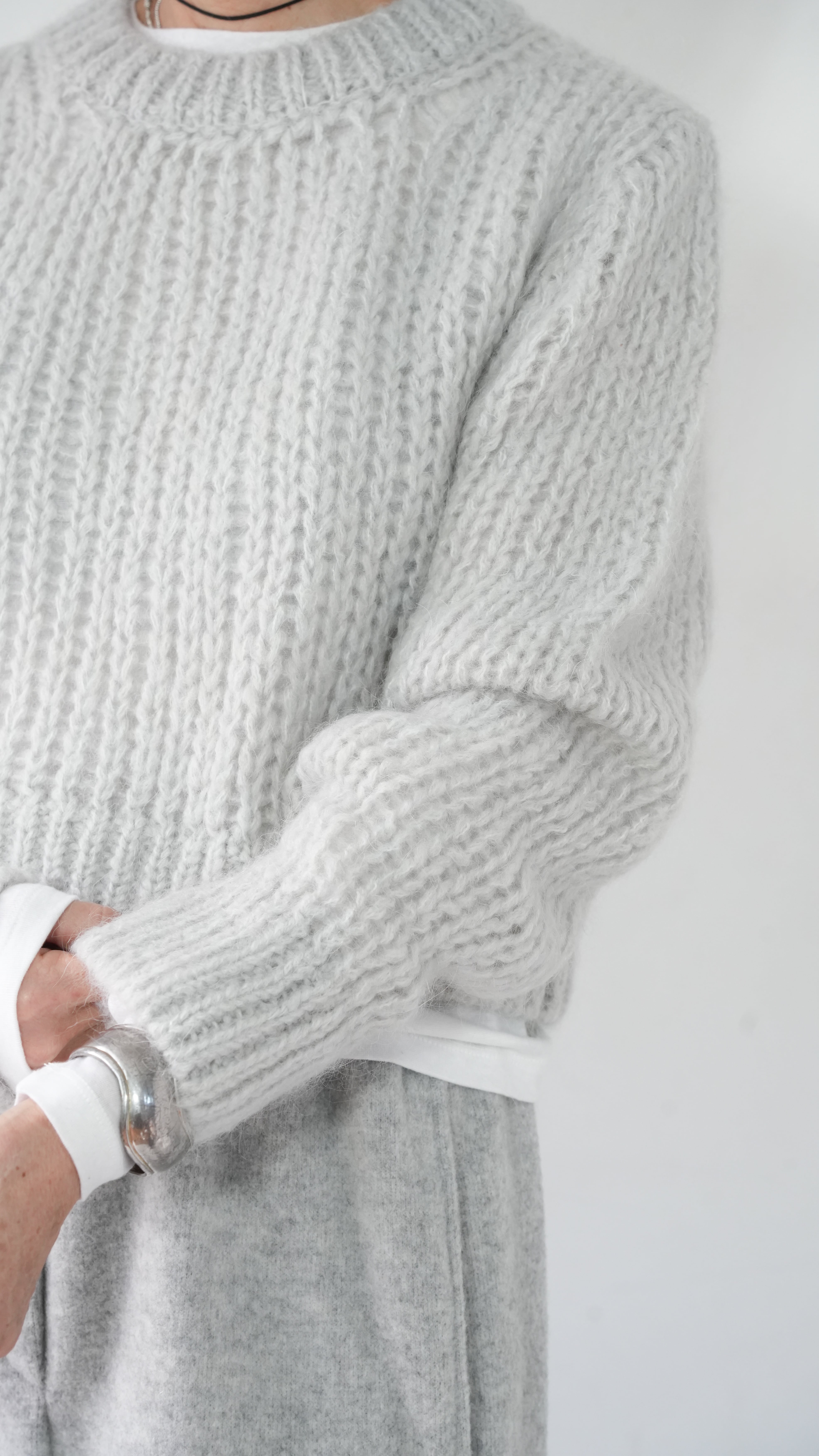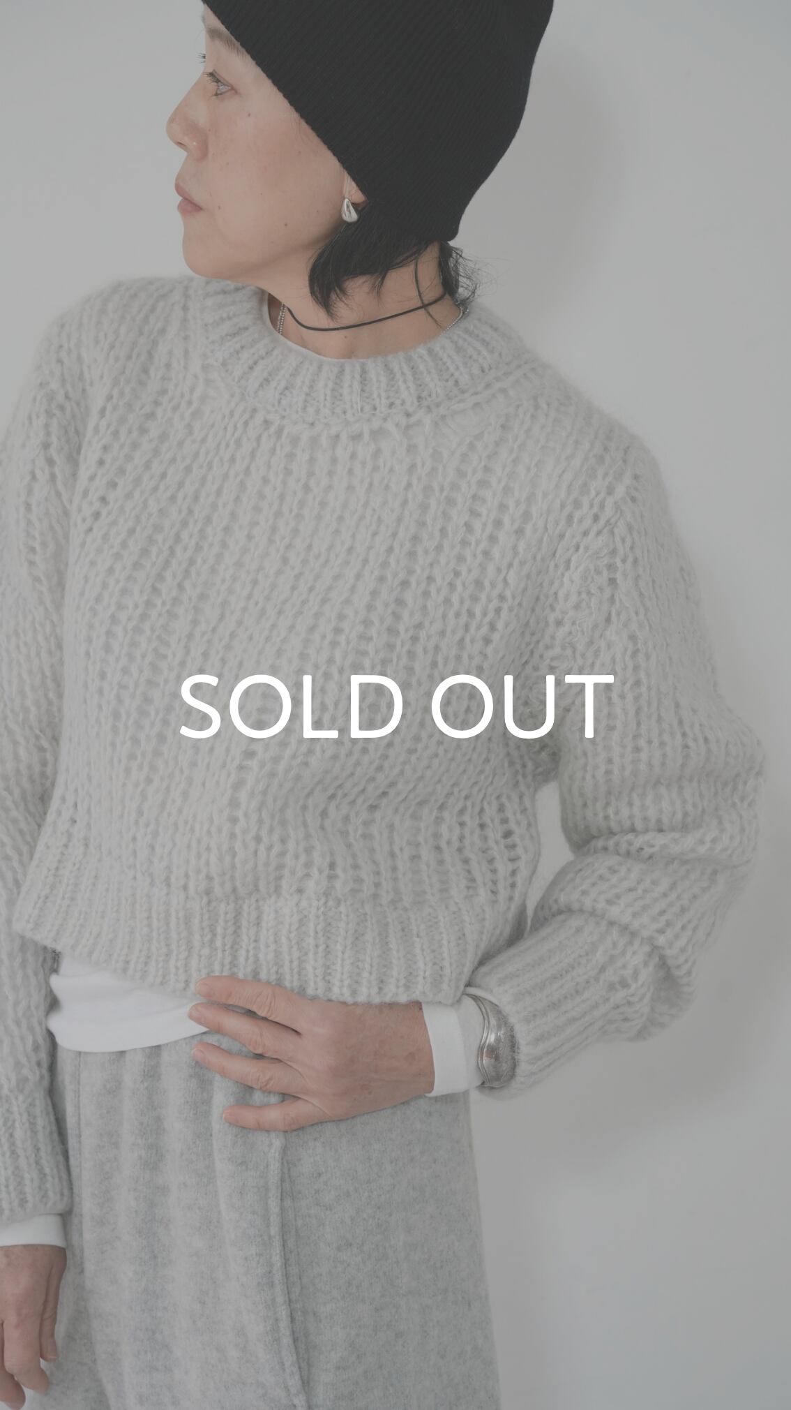 軽くて暖かいモヘアニットを、あえてメンズライクなベーシックニットをウエスト丈で仕上げ、洗練された表情に。