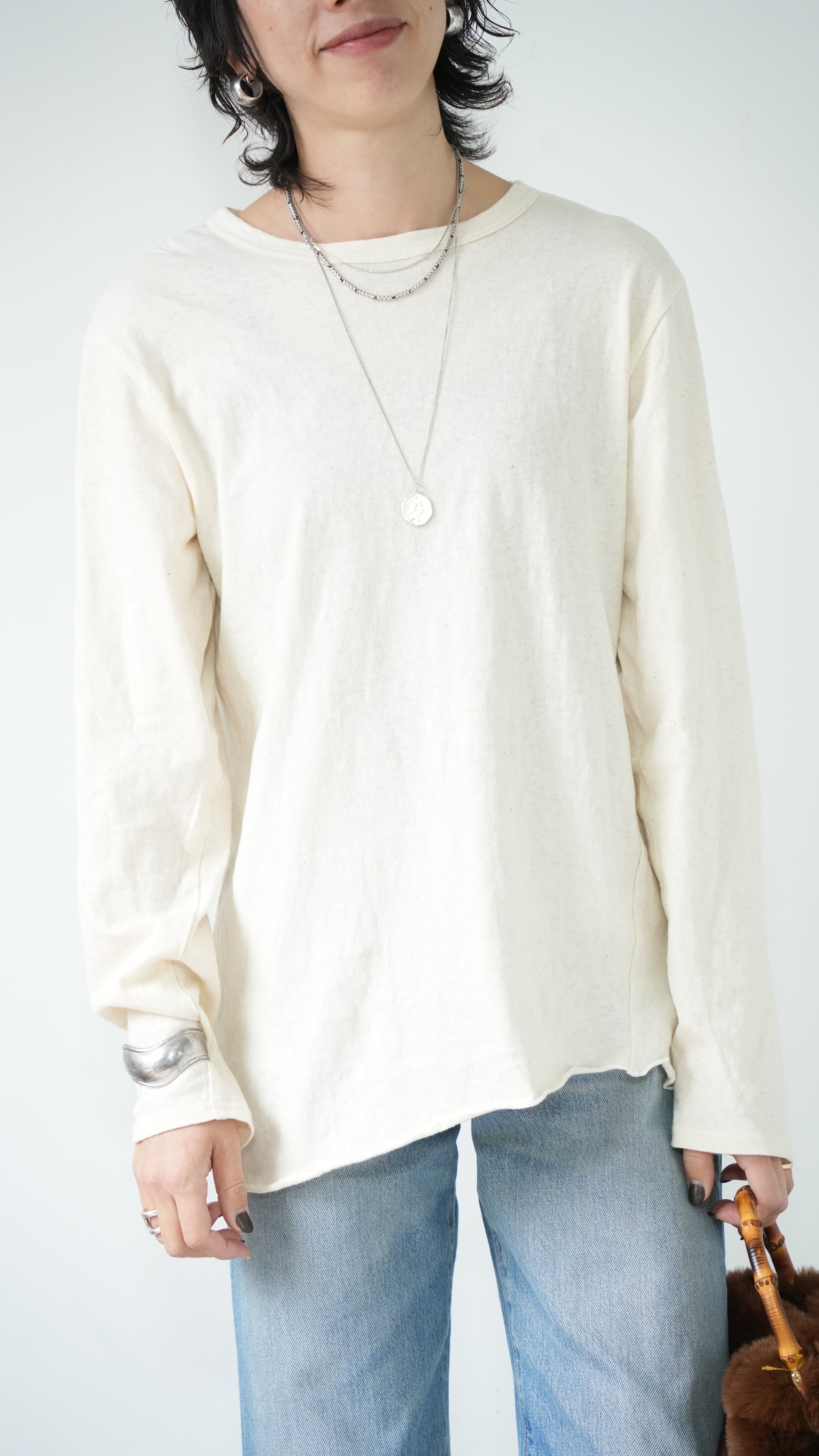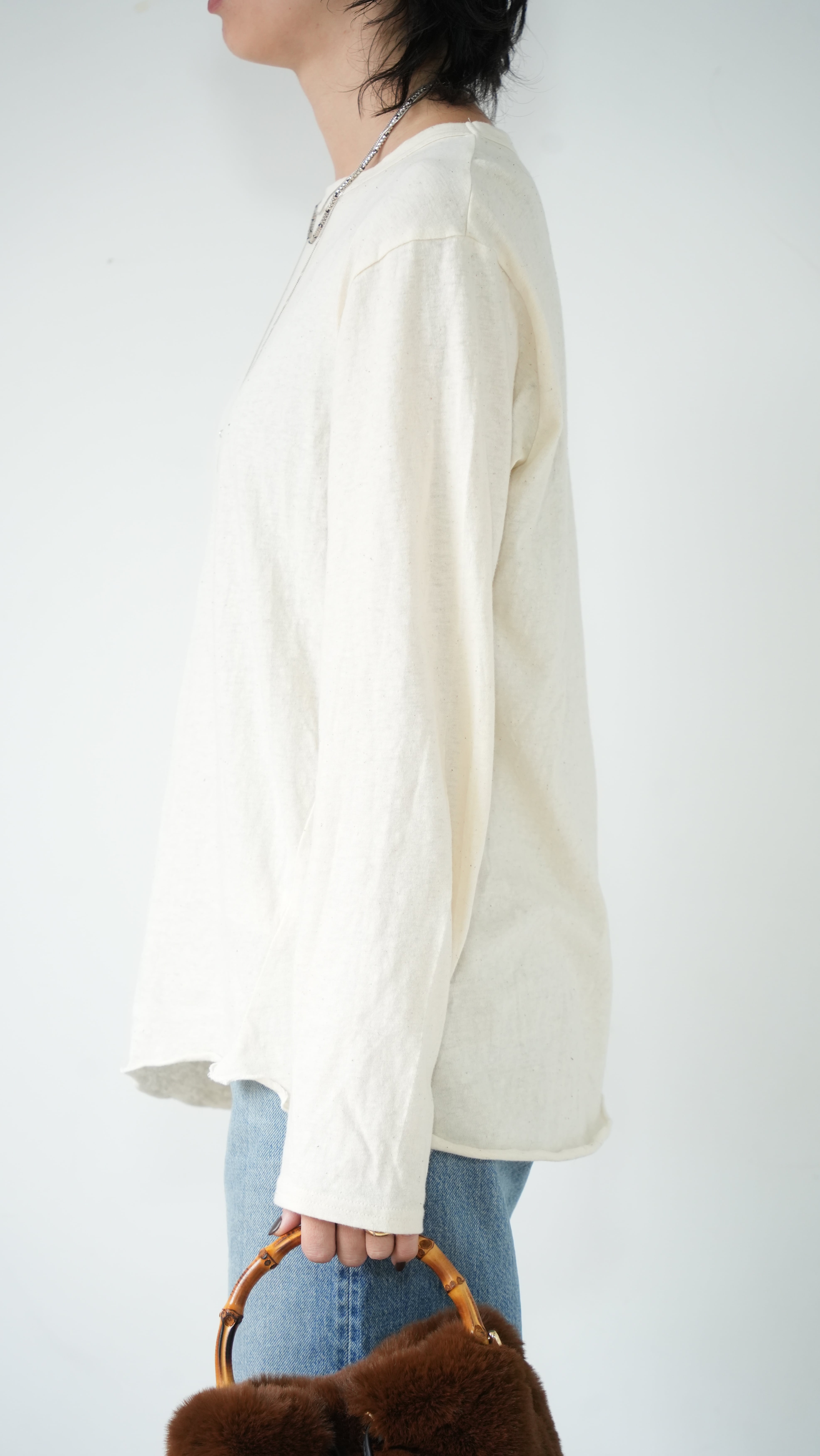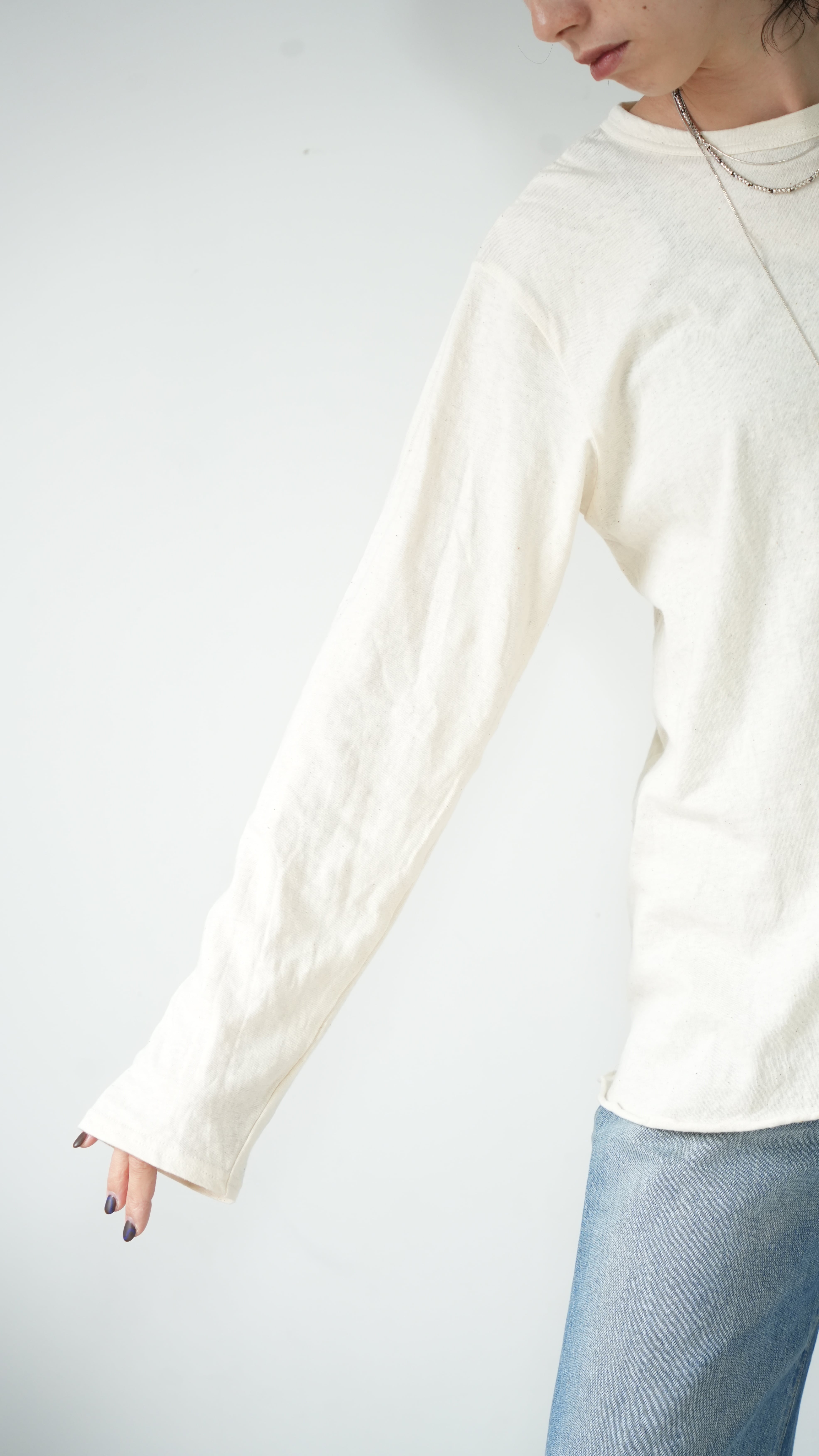 素材のよさと、丁寧な仕立てにこだわり、生地を探すのに約1年を費やし、理想を追求したレイヤードTシャツです。ニットやトレーナーに必ずある定番のカラーに合うように考え、日本製の柔らかい生地とのバランスを見ながら、手を加えなくても見えたいように見えてくれるのがレイヤードTEEの最大の魅力。洗濯機で洗え、ガシガシ着れて、ニットやトレーナー、カーディガンの中、ベストの中にもおすすめです。