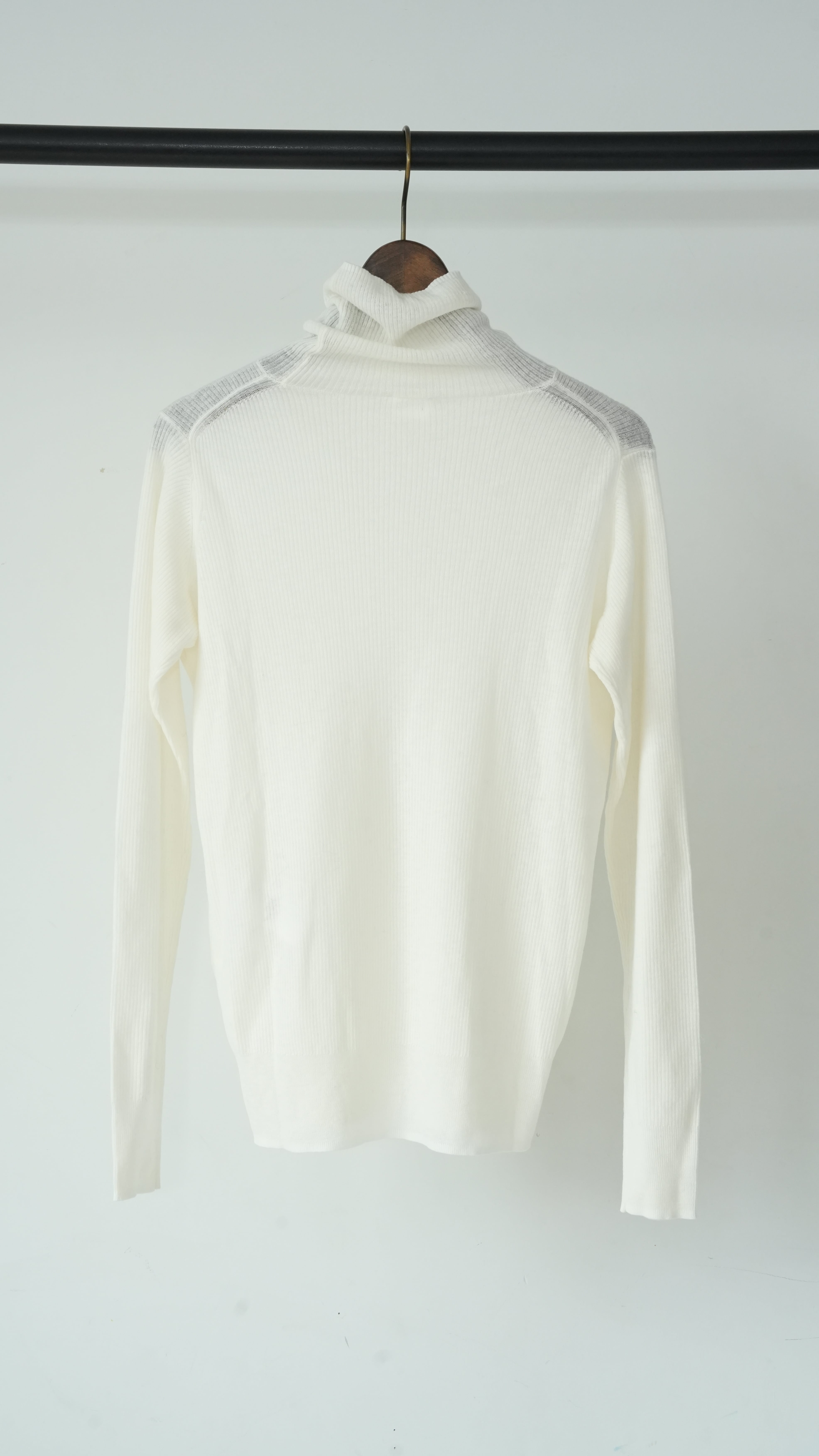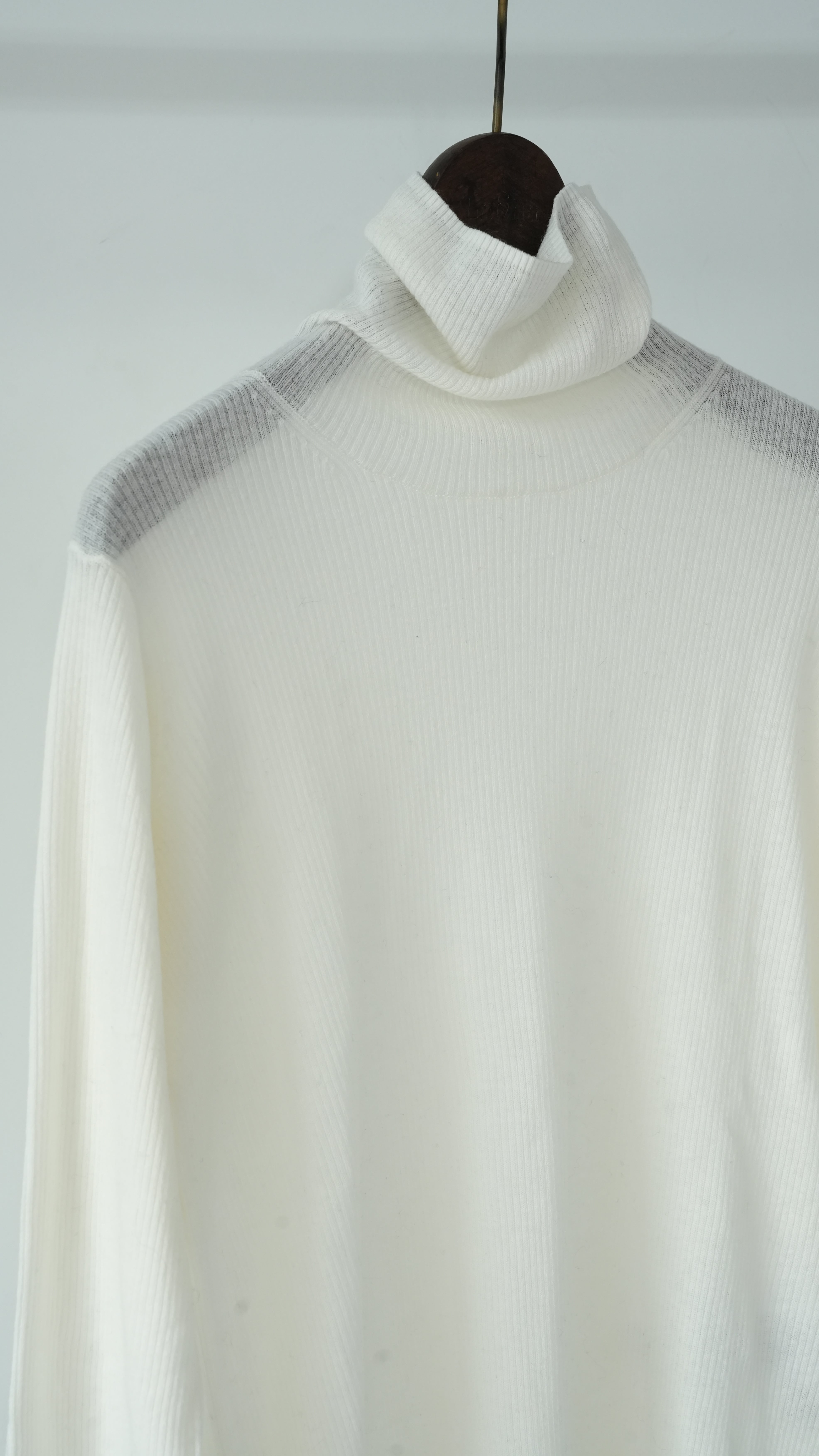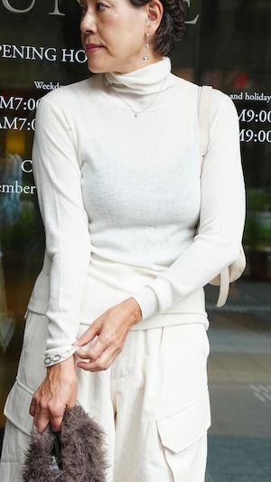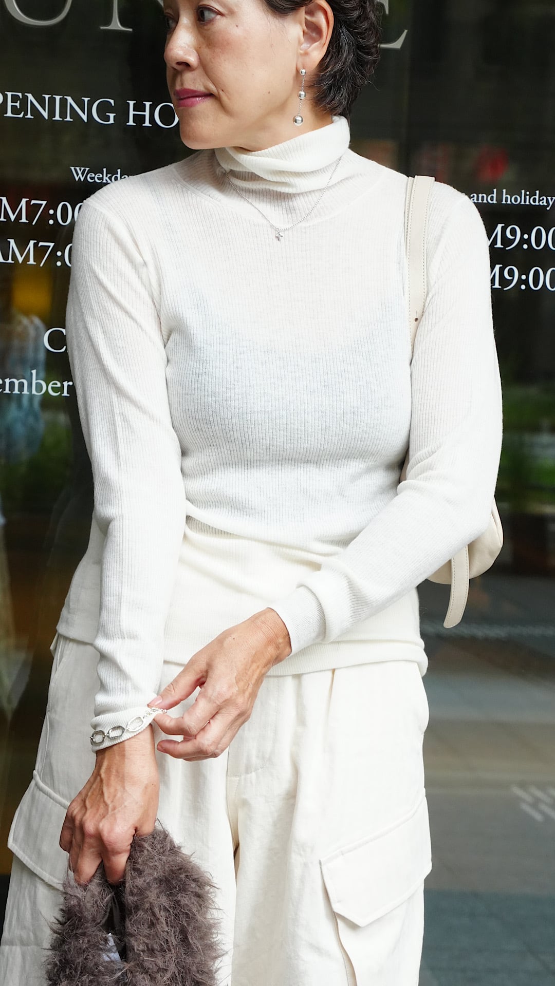 原料からこだわって作った特殊な糸で、とても軽く、薄く、そして暖かく仕上げました。リブですが程よいサイズ感で、体のラインを拾いにくく、着心地の良いシルエットに仕上げています。