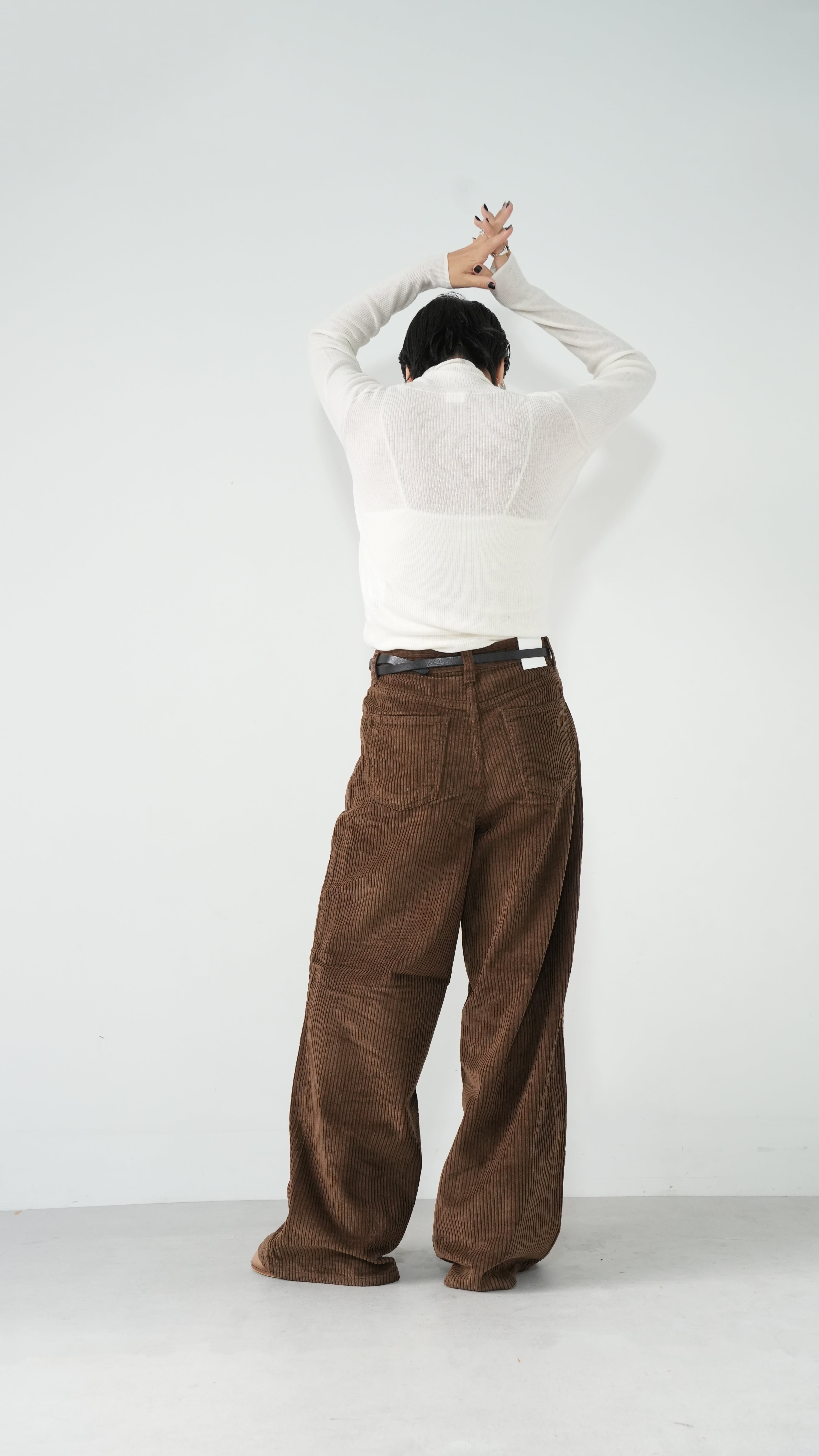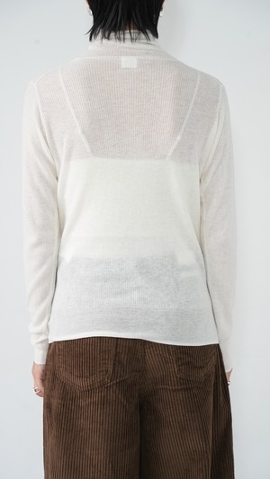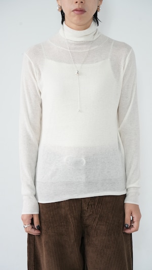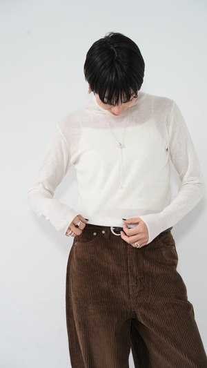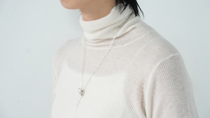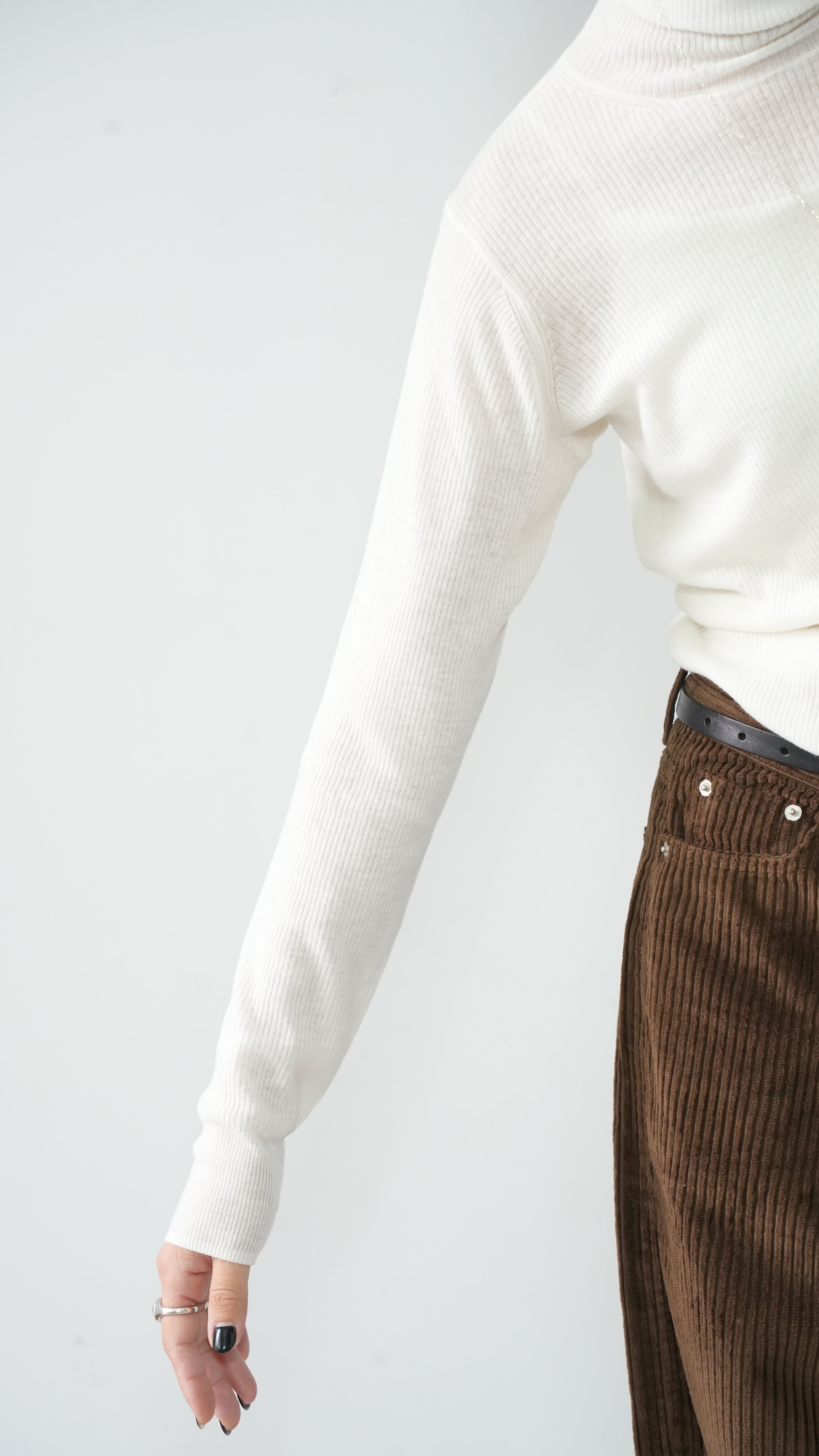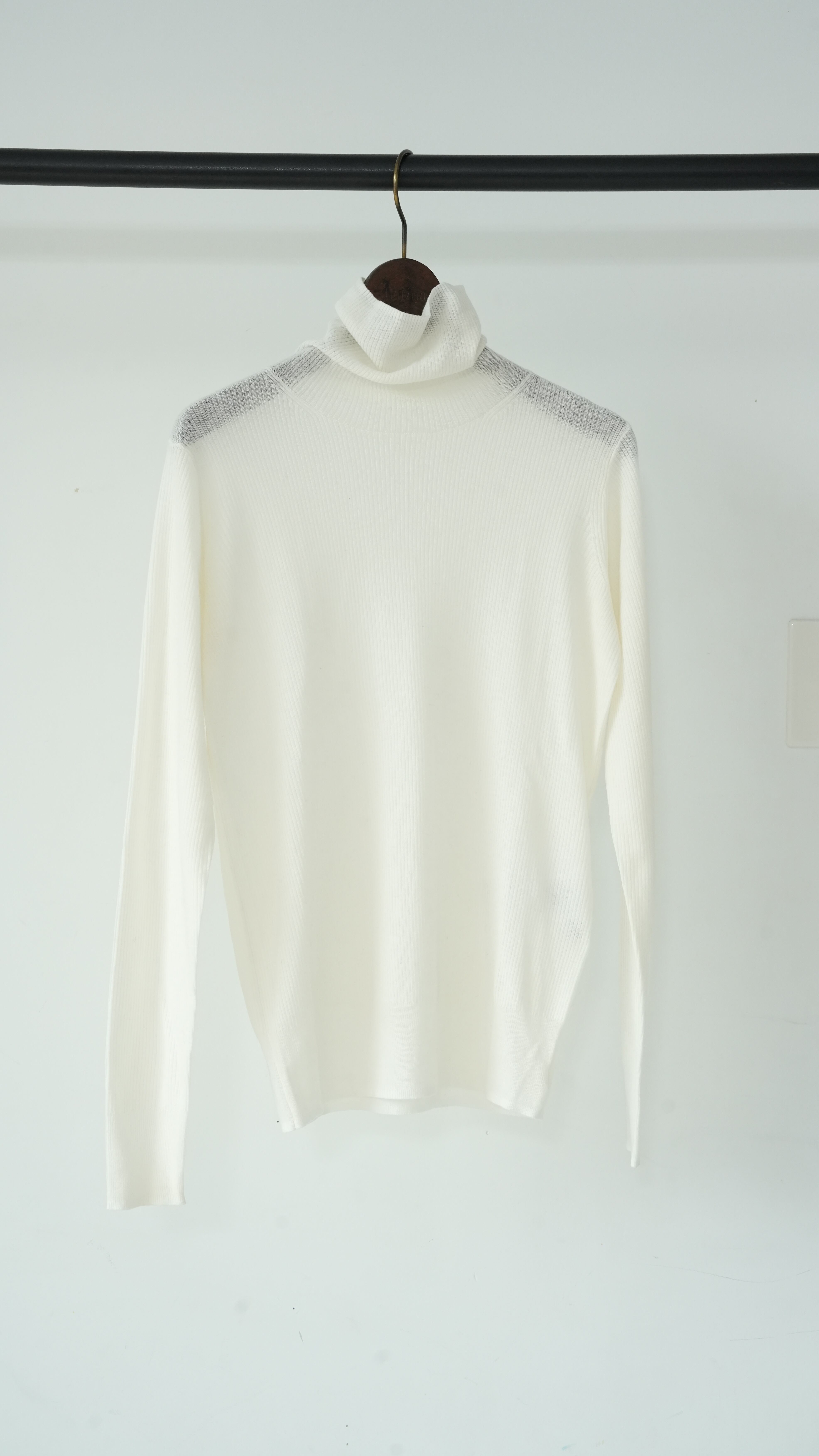 原料からこだわって作った特殊な糸で、とても軽く、薄く、そして暖かく仕上げました。リブですが程よいサイズ感で、体のラインを拾いにくく、着心地の良いシルエットに仕上げています。