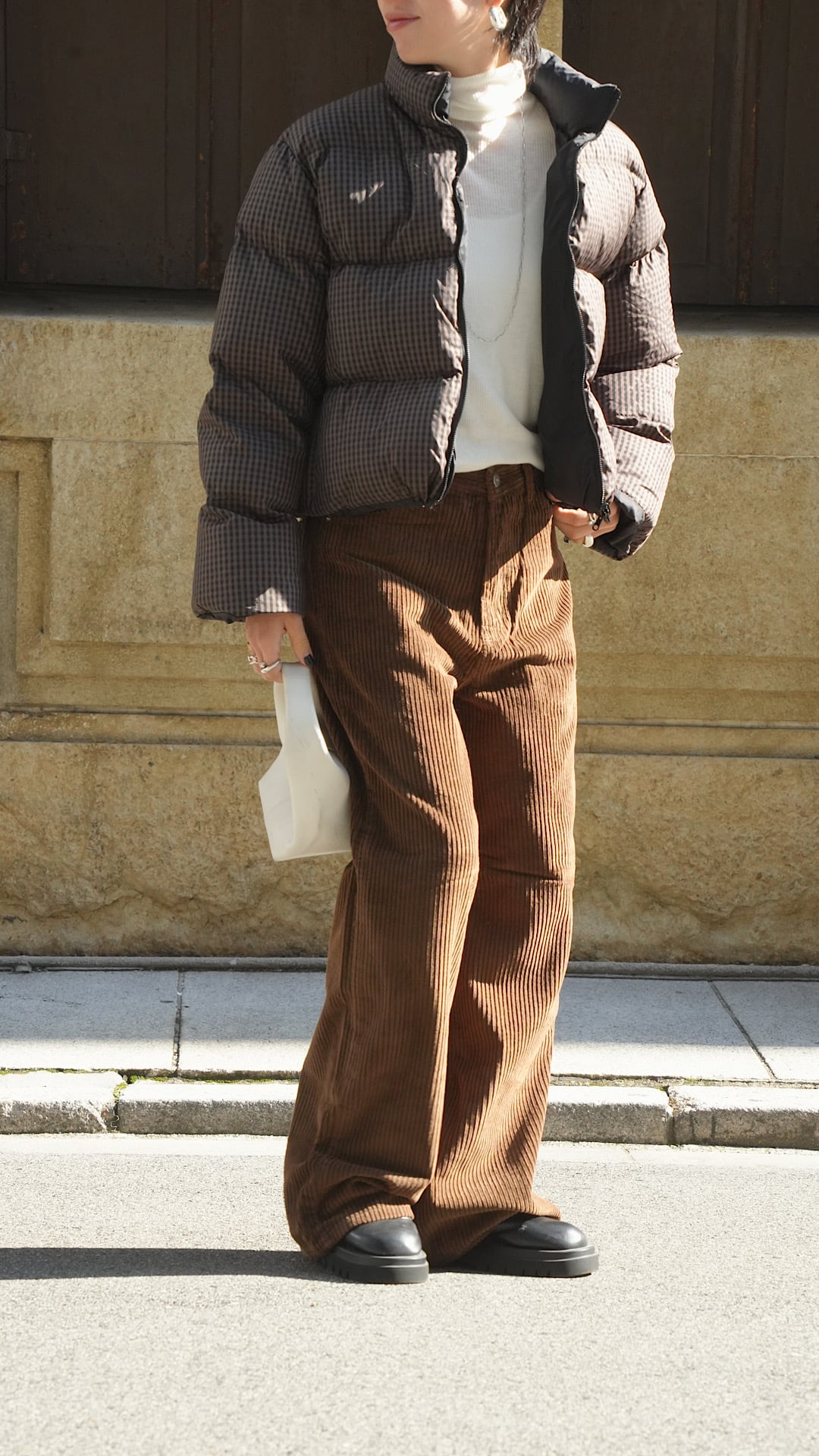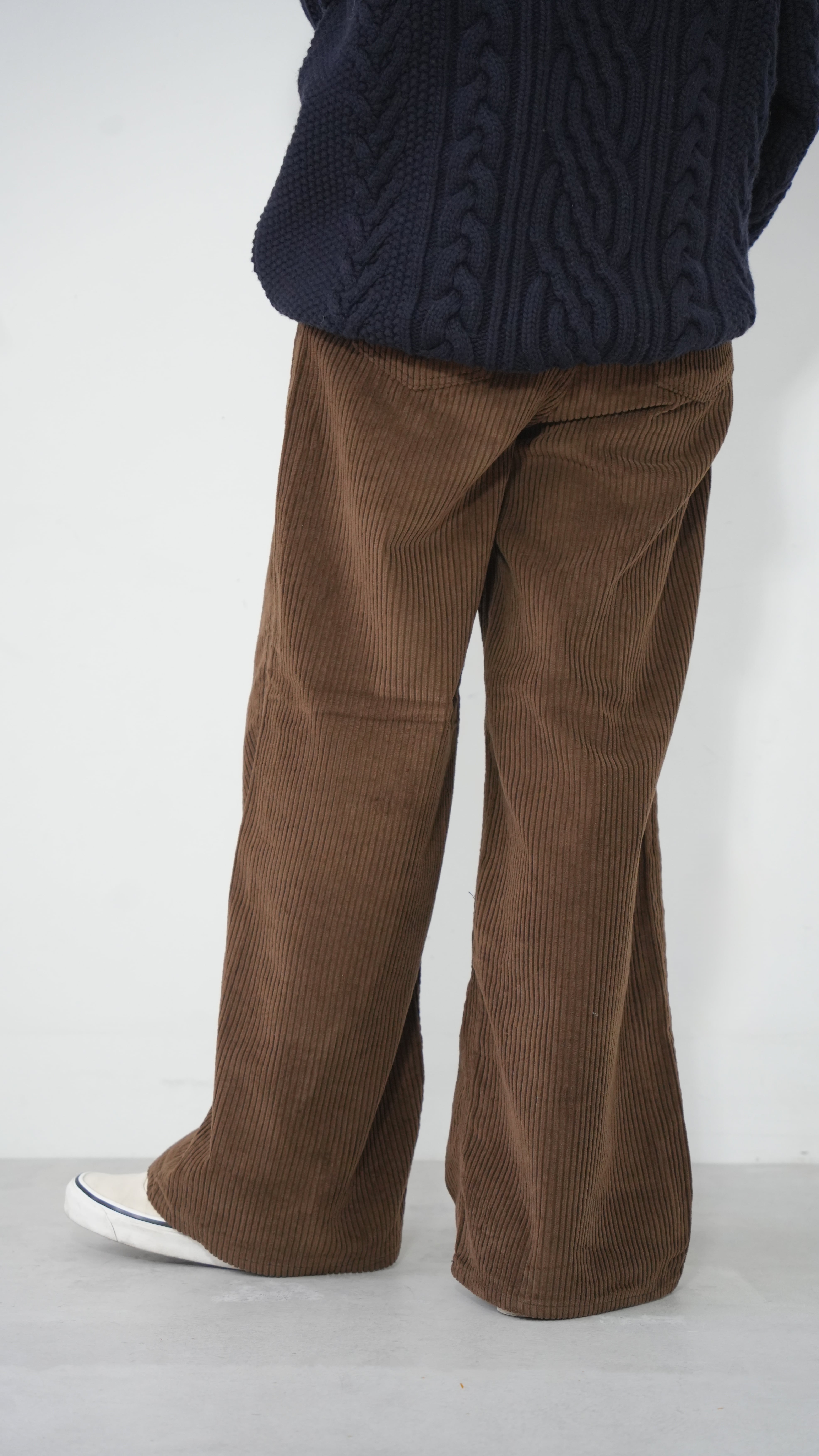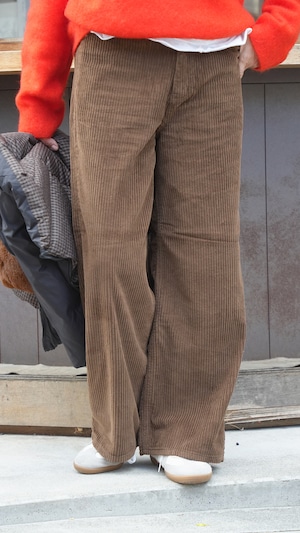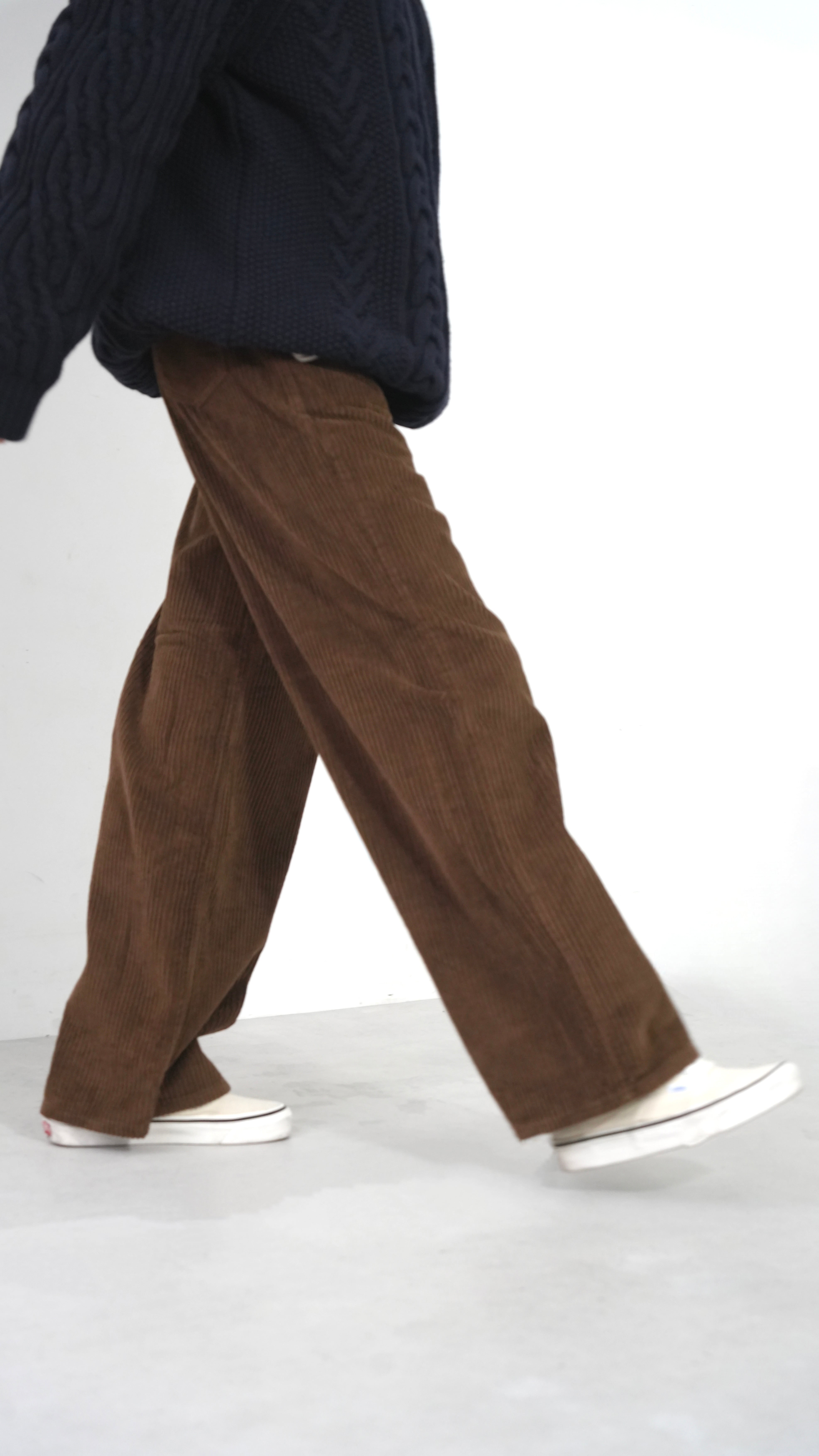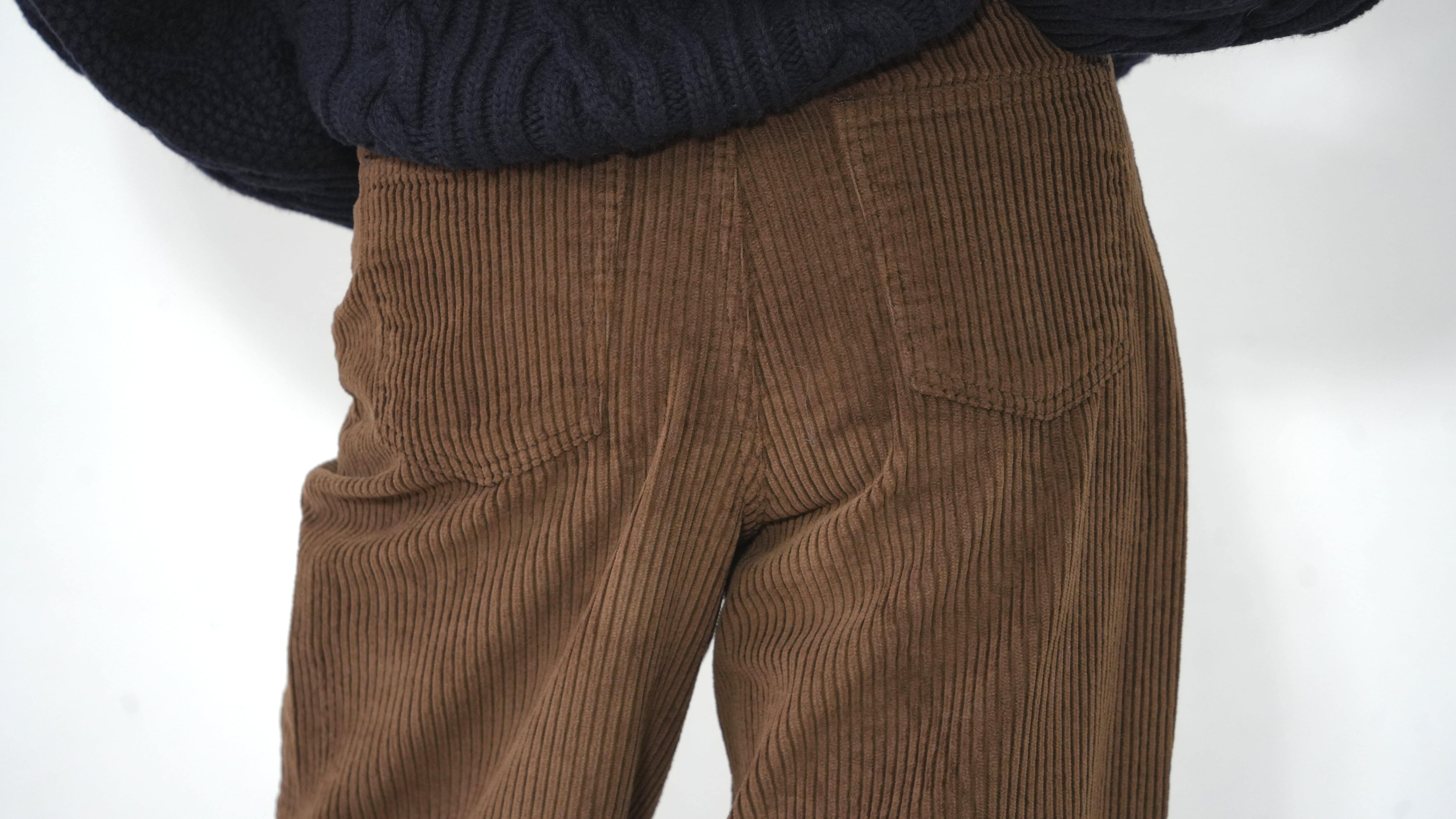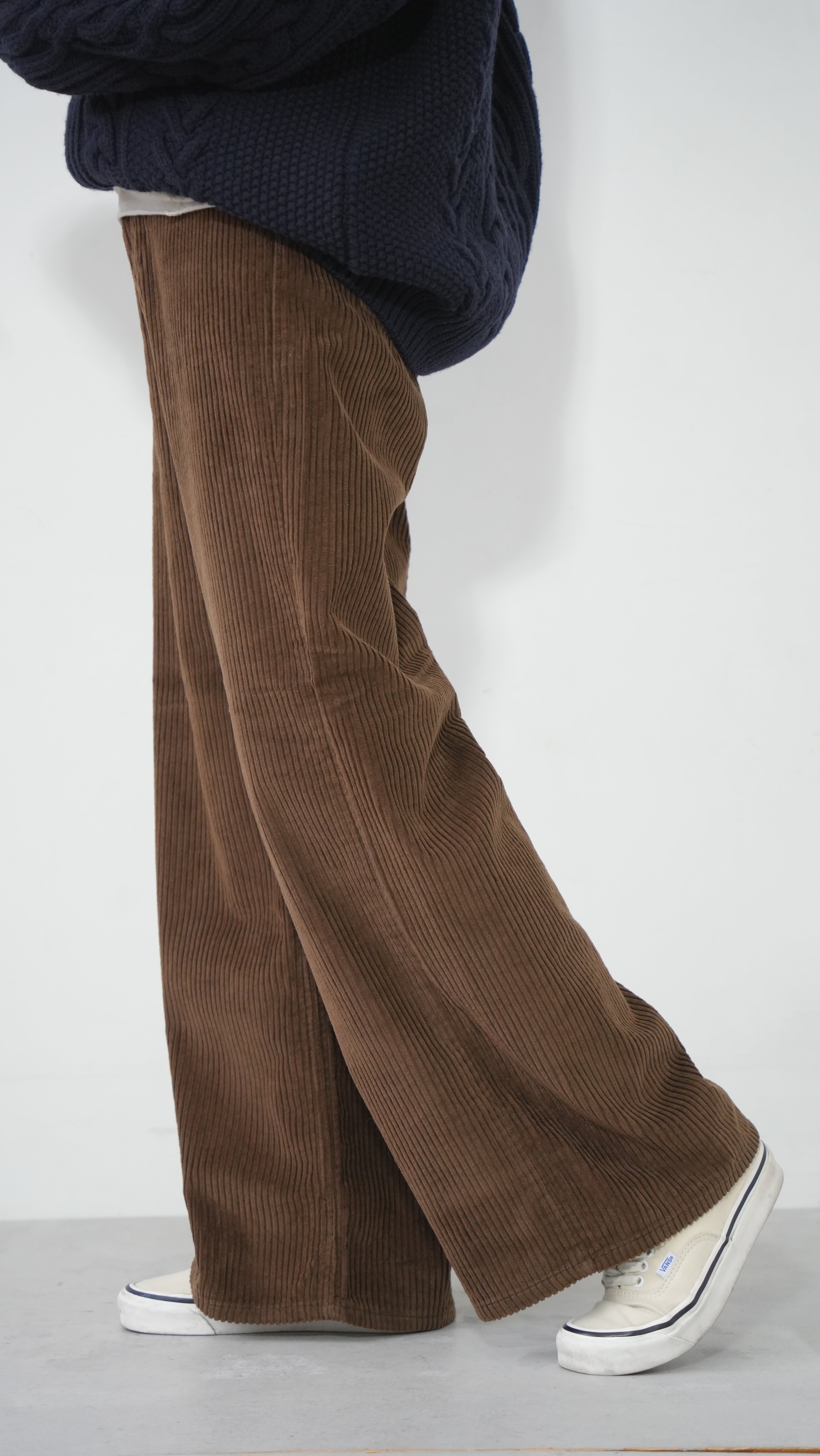 70年代を彷彿とさせるヴィンテージライクな表情があり、落ち着いたカラーが、大人の落ち着いた雰囲気を感じさせるワイドパンツ。